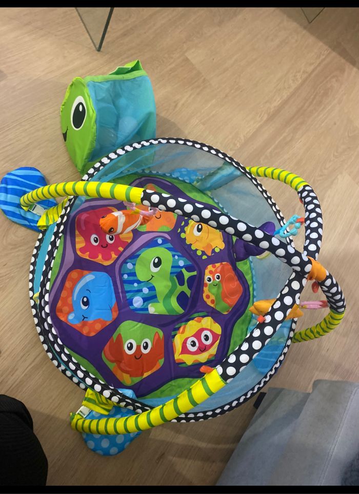 Tapis d’éveil animaux de la mer il y’a à aussi des balles en plastique qui se range dans la tête de la tortue