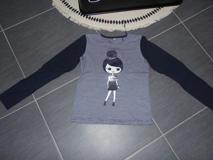 Bonjour 👋 Je vend ce : 👉 T-shirt ml fille 12 ans * noir, bleu à rayure motif fille 👧 Maison 🏠 non fumeur et sans animaux