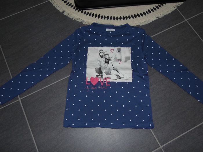 Bonjour 👋 Je vend ce : 👉 T-shirt ml fille " in extenso" 12 ans * bleu à pois avec motif personnage sur vélo 🚲 Maison 🏠 non fumeur et sans animaux