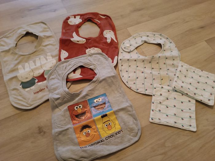 Vend lot de bavoirs avec 2 carrée (ensemble avec bavoir) Petite taches sur la blanche rien de méchant