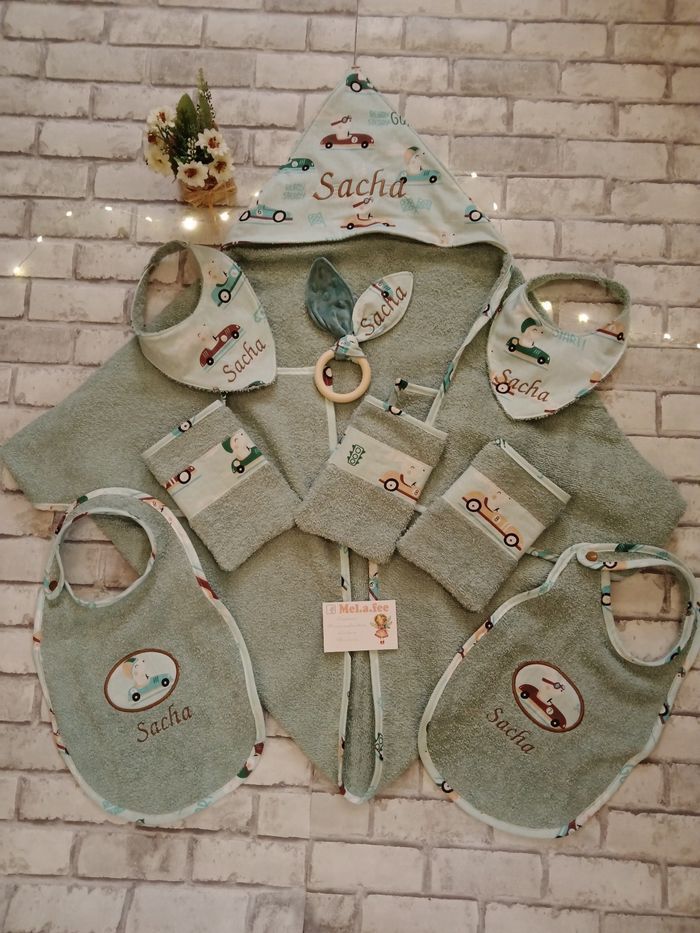 Comprend 1 cape de bain 115/65 cm (29.7€) 1 bavoir grand format (8.8€) 2 bavoirs bandanas (7.15€) 4 gants de toilettes tailles enfant ( 9.35€) Un anneau lapin (5.5€) Le tout en coton et éponge œko tex neuf non lavé Une multitude de tissus possible Le lot pour 55€ au lieu de 60.5€ Broderie possible a 0.5€ / pièce Choix des tissus et de la couleur de broderie Ce lot a été modifiée et comprends un grand bavoir en plus a la place d'un gant de toilette. Le lot de base est repris en description. Mais modifiable au nécessaire ( prix variant en cas de changement)