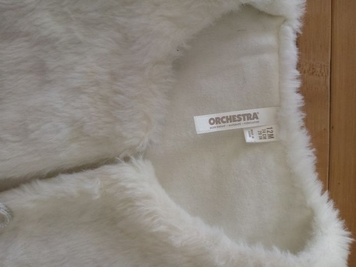 Petit gilet sans manches effet fourrure blanc de chez orchestra S'attache devant juste avec 1 petit noeud ou se porte ouvert 12mois mais peut se porter plus.