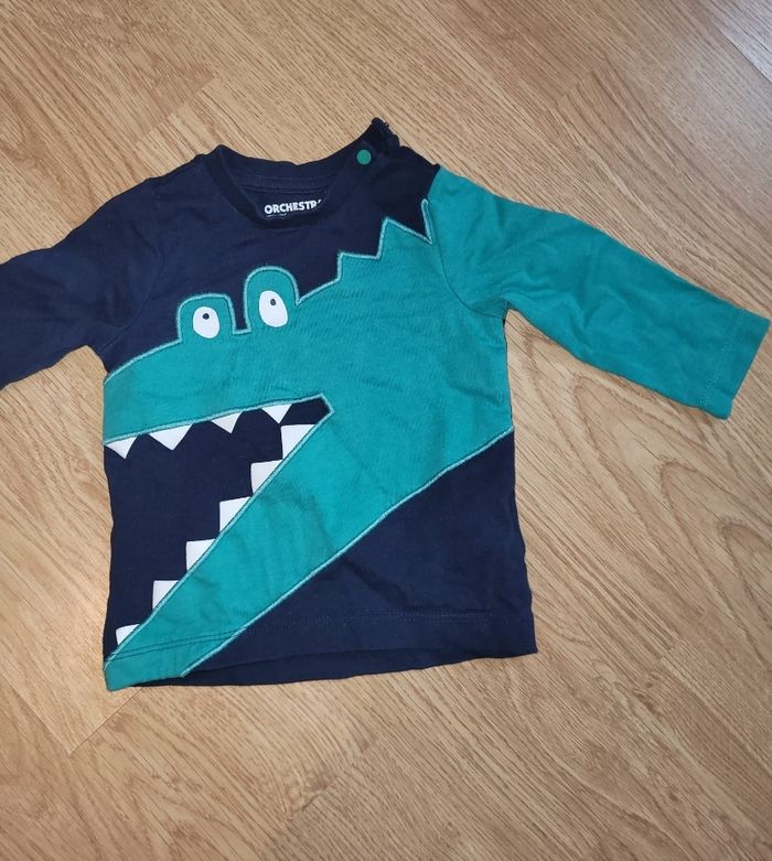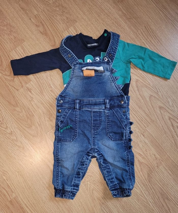 Salopette orchestra pantalon + tee-shirt manche longue. Très bon état. La salopette s'ouvre par le bas. Taille 6 mois.