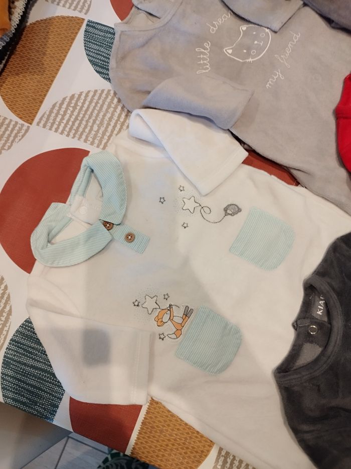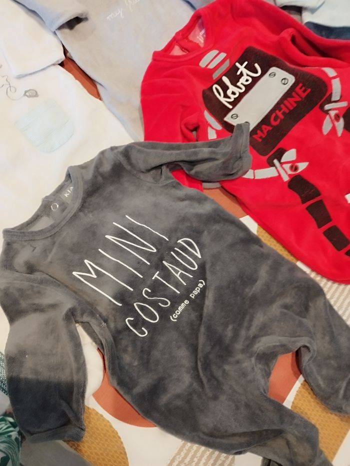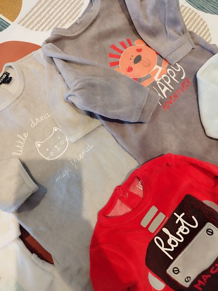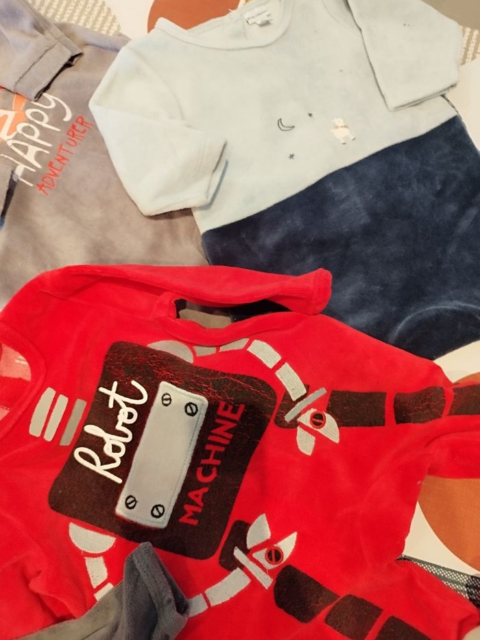 Lot de 6 pyjamas, différentes marques (Mon premier Major, Kiabi, Orchestra, P'tit bisou). Le rouge robot a juste un mini trou près d'une pression mais ne gêne absolument en rien pour le fermer. Ils sont en bon état !!!