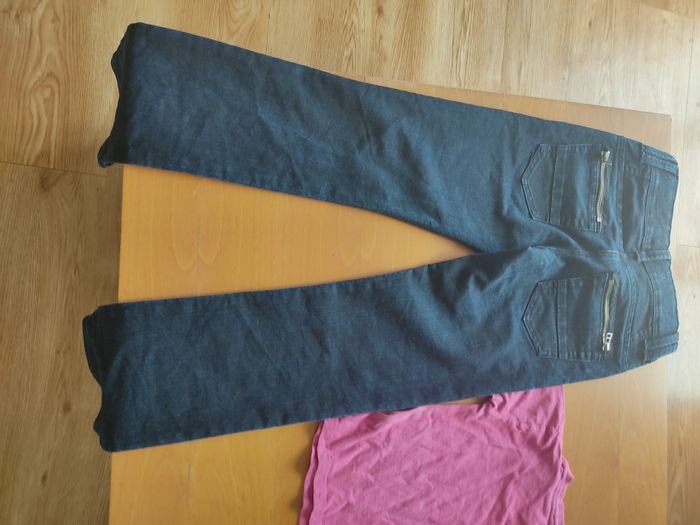 Pantalon jeans taille 12 ans mais plus pour du 10ans bon état déjà porté quelques petits fils mais rien de bien méchant et tee shirt taille S mais taille petit plus pour du 8/10ans bon état déjà porté