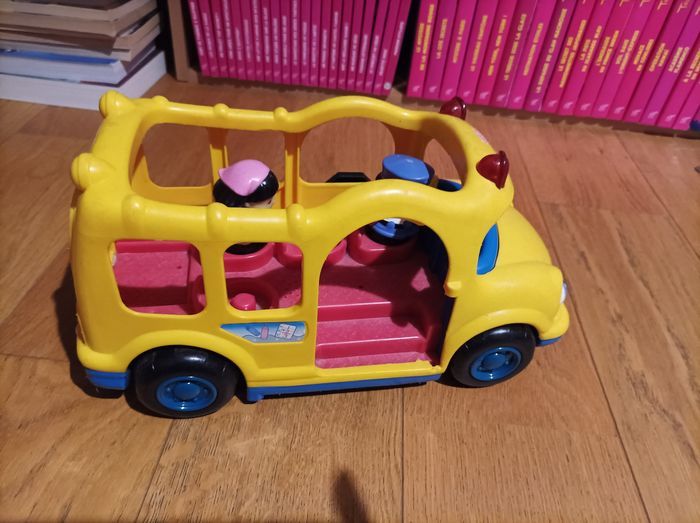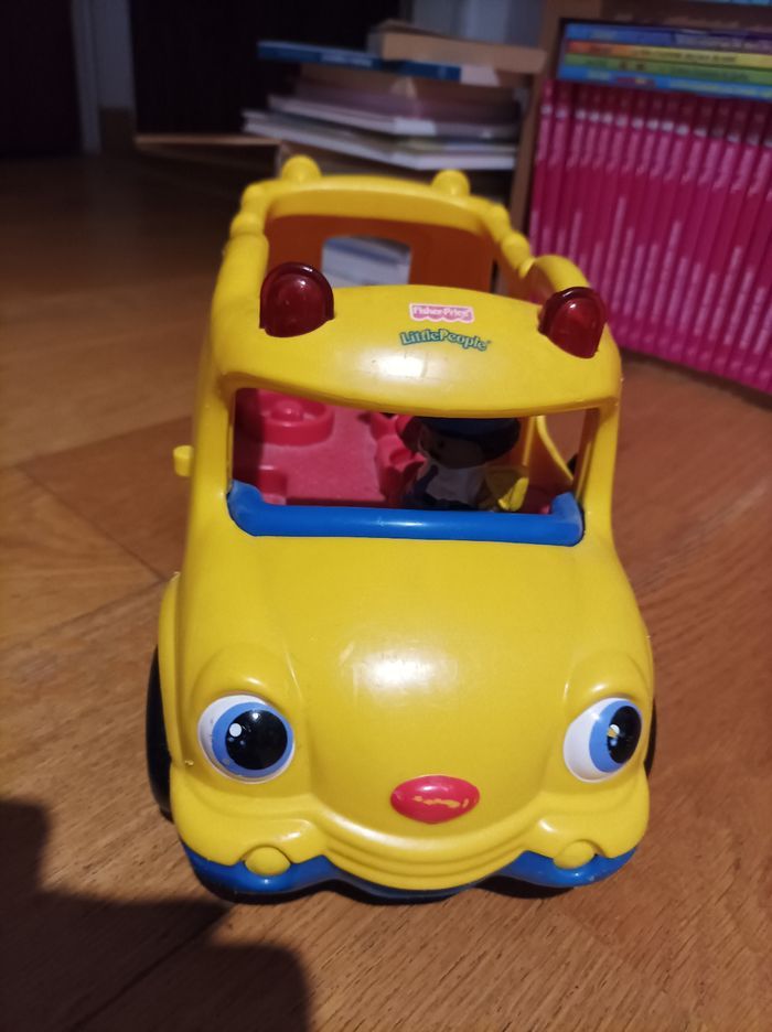 Autobus little people - Fisher Price - type school bus avec deux personnages qui fait des son ou de la musique lorsqu'on appuie sur un bouton sous le personnage. Très solide et de grosses pièces idéal pour de très jeunes enfants qui aiment ce qui roule ! ~25cm