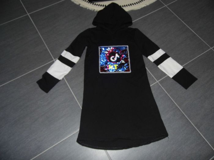 Bonjour 👋 Je vend cette : 👉 robe fille 👧 10 ans * noir avec motif tik tok en sequin réversible Maison 🏠 non fumeur et sans animaux