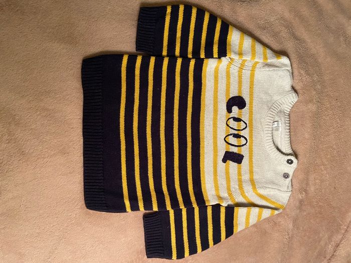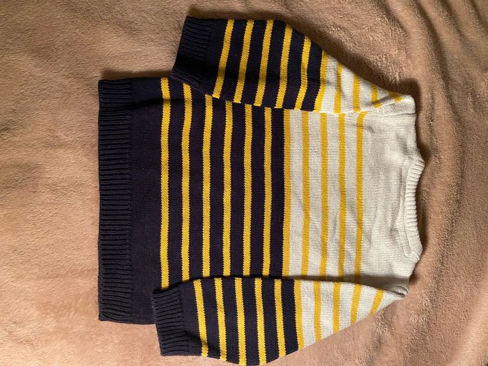 Pull marinière jaune moutarde bleu et blanc avec écrit cool. En bon état .