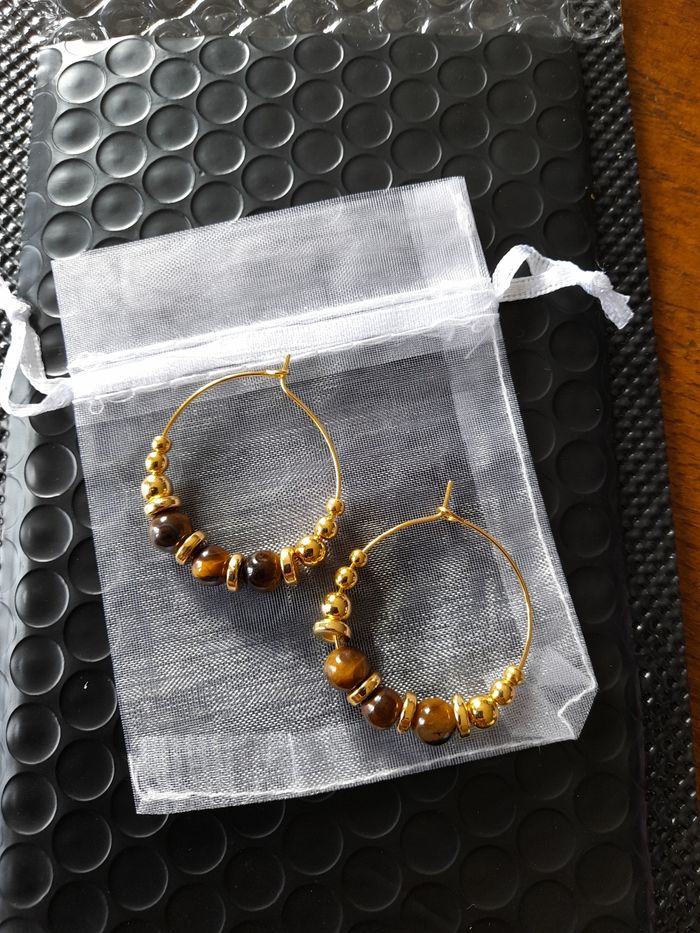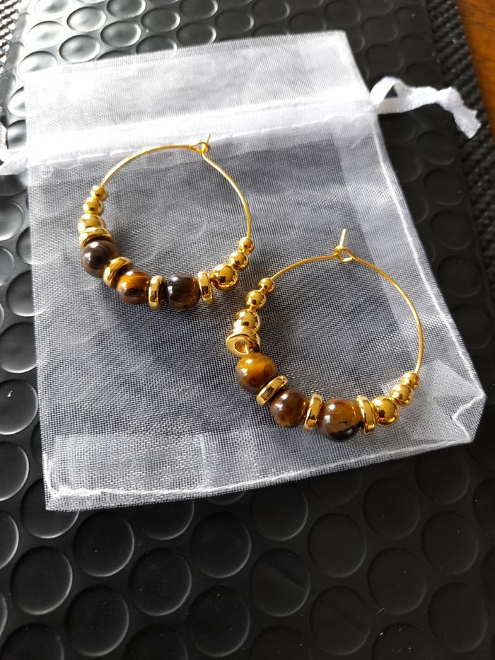 Boucles d'oreilles créoles en acier inoxydable doré . Ornées de perles dorées et pierres naturelles Œil du tigre (brun). Fait main ✋ par mes soins. 11€ la paire. N'hésitez pas à me contacter pour toutes demandes complémentaires ;)