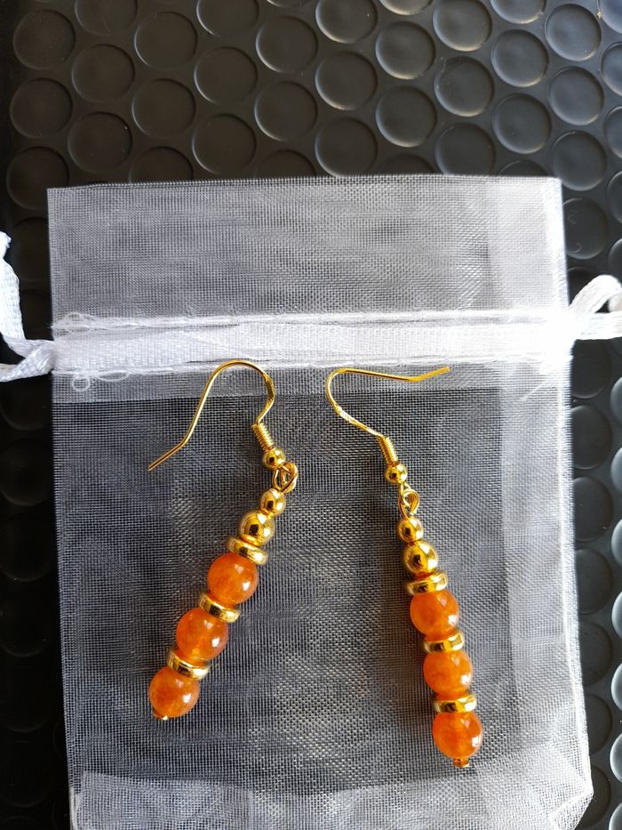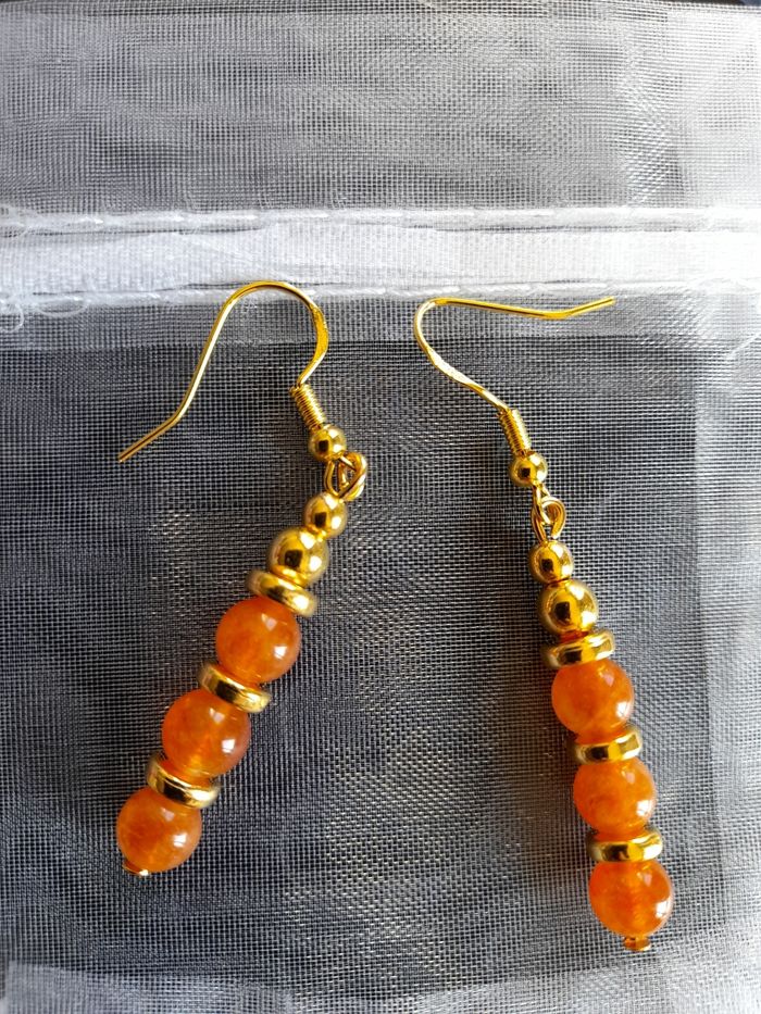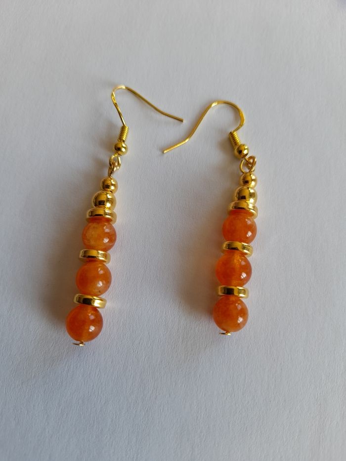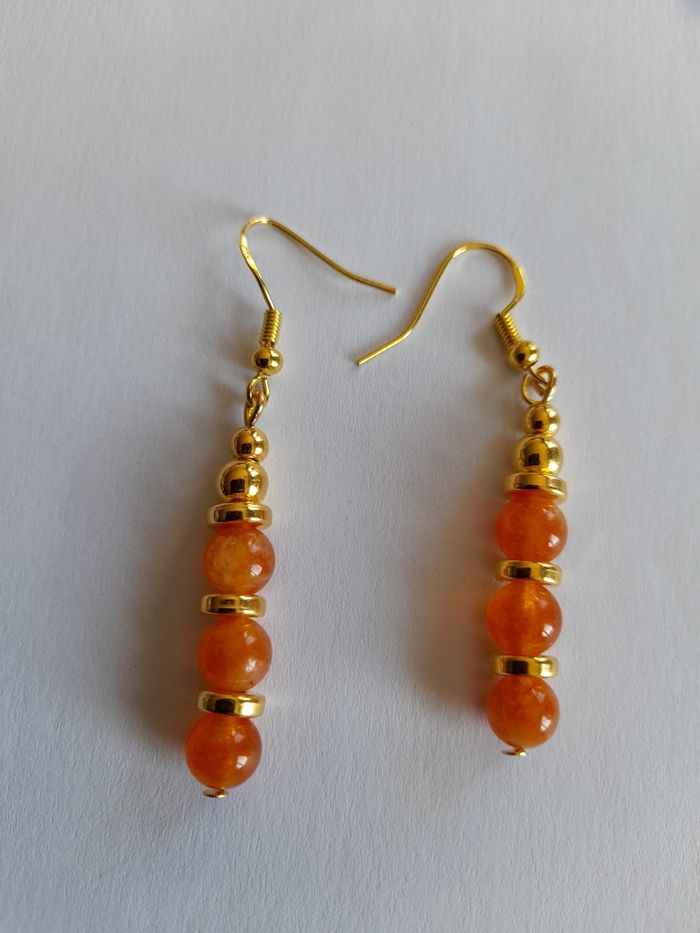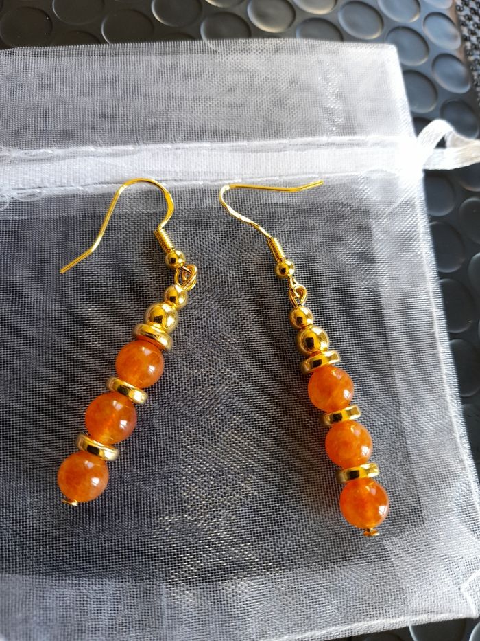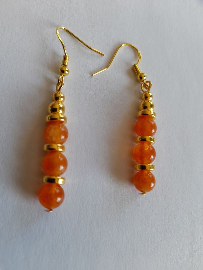 Boucles d'oreilles pendantes en acier inoxydable doré. Ornées de perles dorées et pierres naturelles Pierre de soleil (orange). Fait main ✋ par mes soins. 11€ la paire. N'hésitez pas à me contacter pour toutes demandes complémentaires ;)