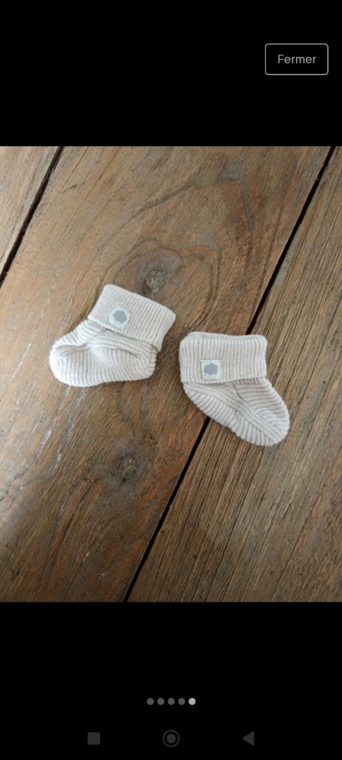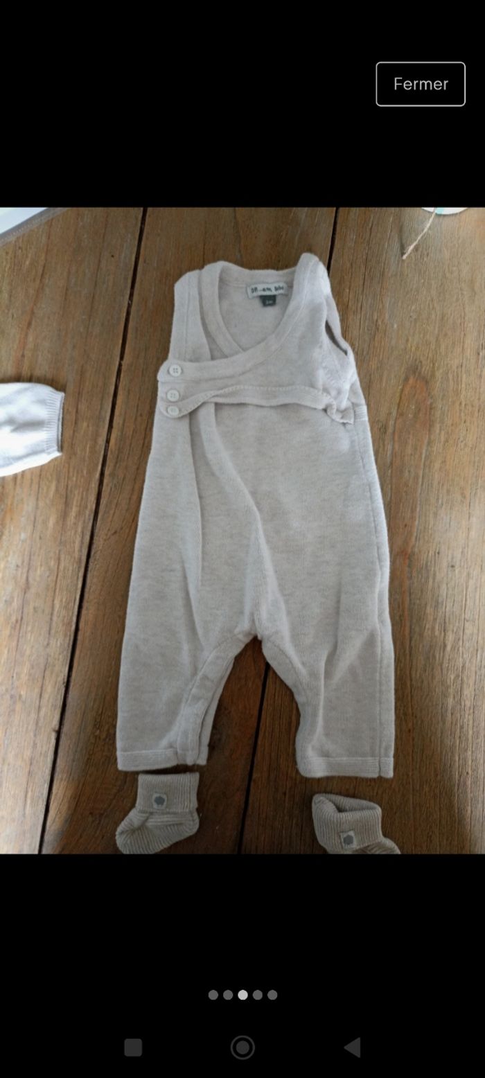 Gilet en maille beige Salopette en maille beige Petits chaussons / chaussettes en maille beige Marque DPAM, taille 3 mois