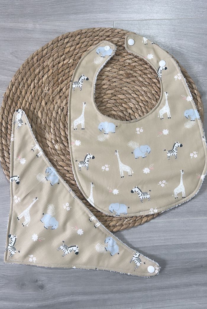 Lot 2 bavoirs ( bandana + simple) Fait entièrement main par mes soins Couleurs blanc Beige Motifs animaux forêt Prix de base 6€ l’unité En coton et éponge Autres tissus et créations disponibles sur demande.