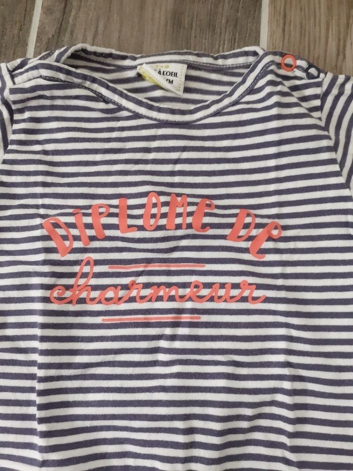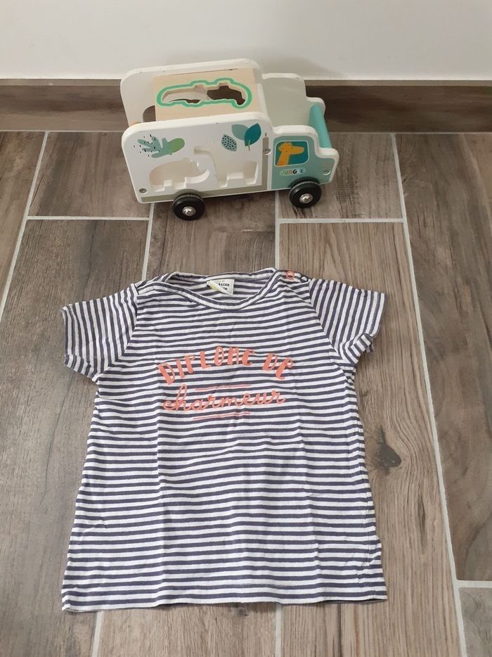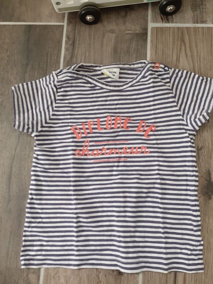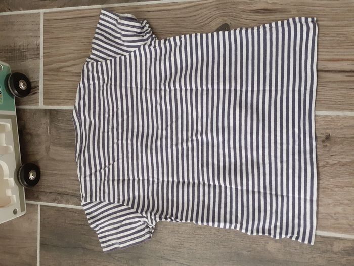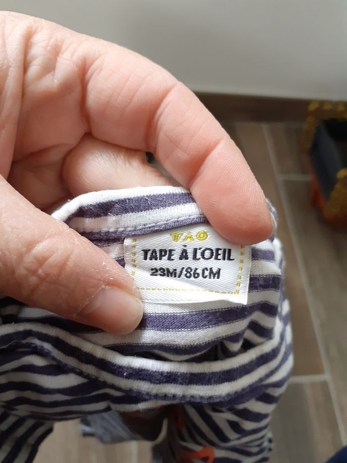 Tee-shirt à manches courtes, taille 23 mois en bon état (un petit trou au niveau des pressions ) porté.
