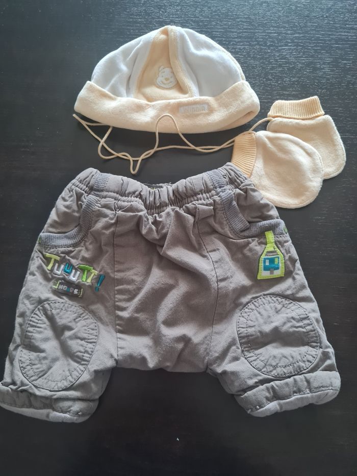Bonnet + gants naissance - 3 mois Pantalon en bon état général porté deux fois 1 mois ( pantalon orchestra )