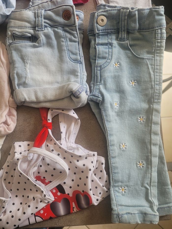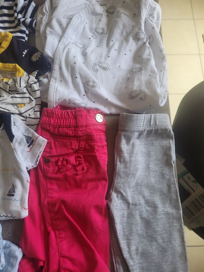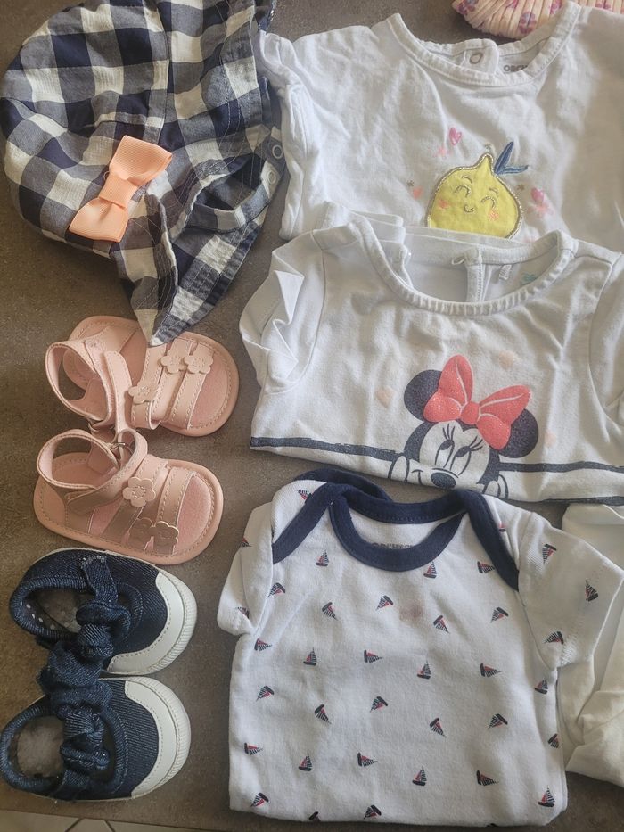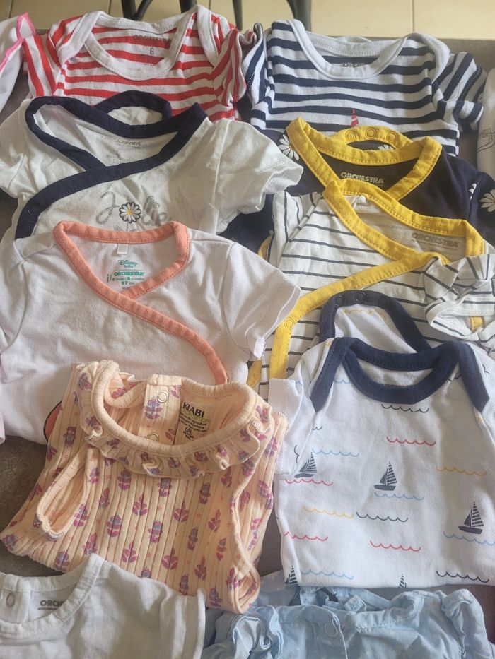 Lot de vêtement été en 6 mois comprenant 20 vêtements 7 body plus 1 offert cause tâche 2 t-shirt plus 2 débardeur 1 Jean plus 1 short plus 1 pantacourt plus 1 legging 1 pyjama léger plus 1 robe 1 bonnet et 2 paire de chaussure 1 body manche longue plus 1 t-shirt manche longue 1 maillot de bain La plus part des vêtements sont de orchestra mult