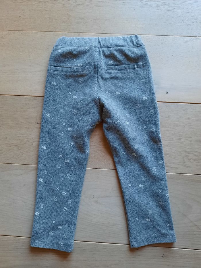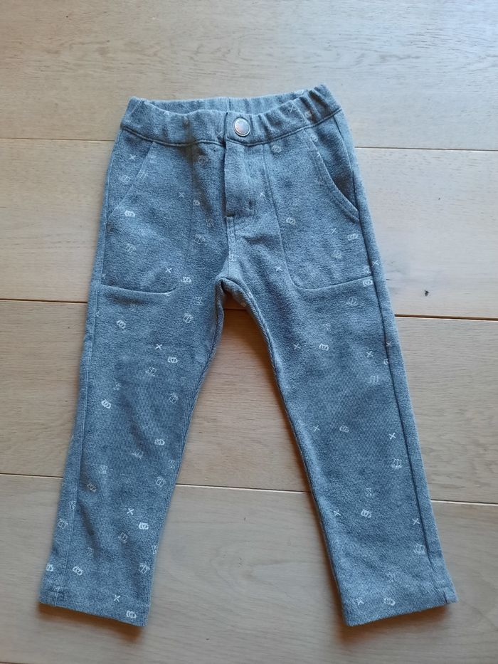 Pantalon Ikks gris imprimé. Taille 24 mois/86 cm Matière 51% polyester, 43% coton, 6% élasthanne. Fermeture par zip+accroche.