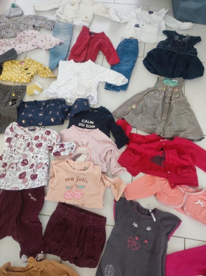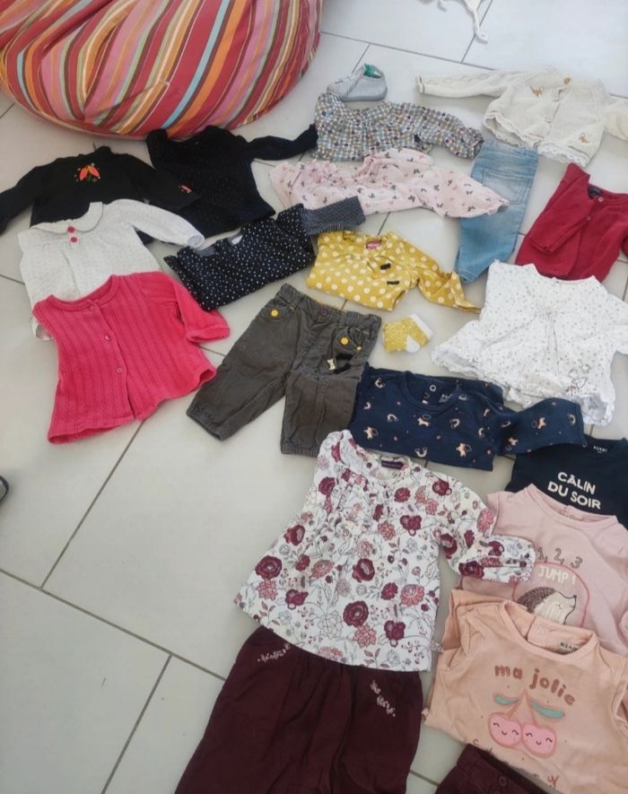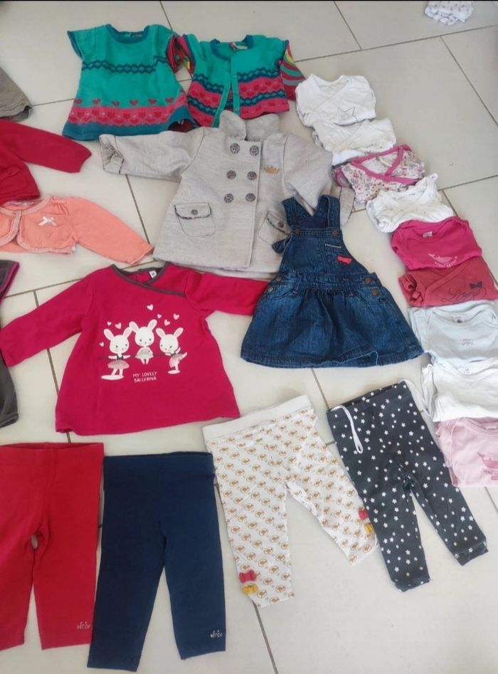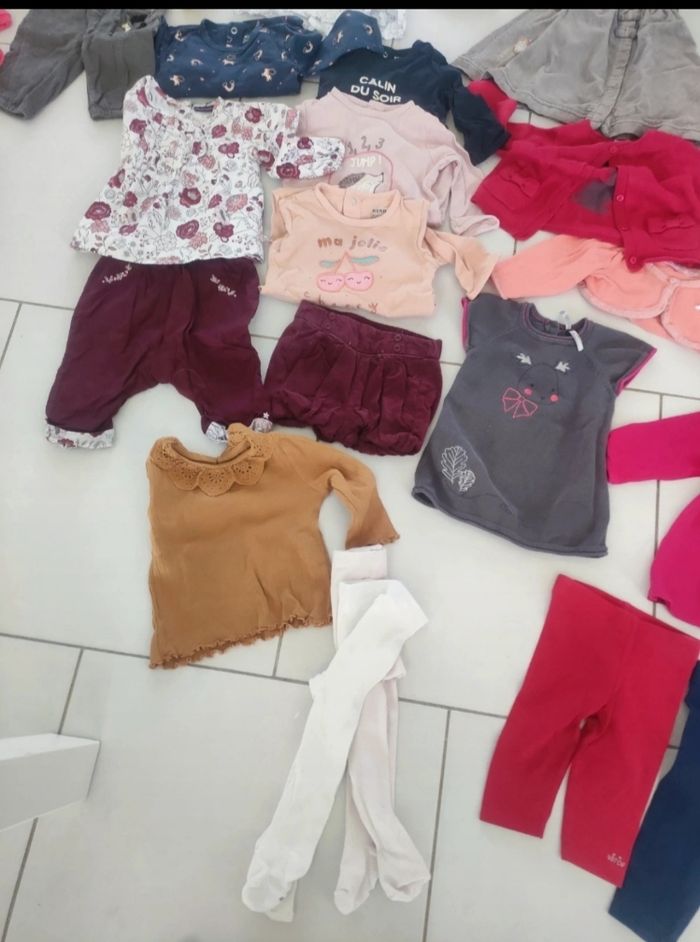 Lot 6 mois 2 collant 15-18 4 leggings 9 bodies manches longues 5 robes 1 manteau 6 gilet 1 pull 4 pyjamas cotons 4 pantalons 10 t shirt 1 t shirt col roulé 1 short épais
