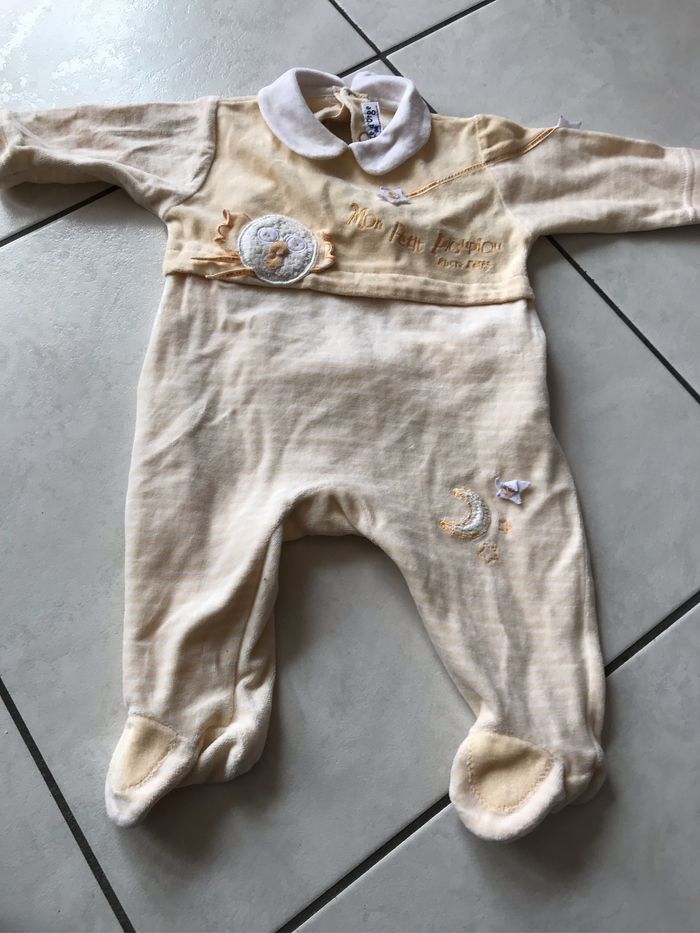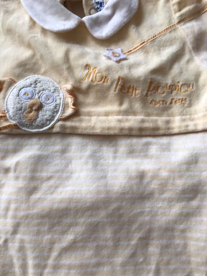 Pyjama jaune et blanc sucre d orge 3 mois Il y a écrit « mon petit pioupiou » Se ferme par bouton pression au dos