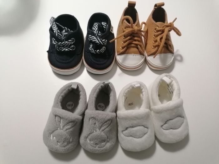 Lot de 2 paires de chaussures et 2 paires de chaussons, bébé 0 à 3 mois. Jamais porté.