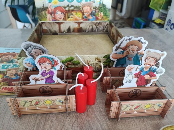 Comme Neuf Complet A partir de 5 ans Revivez l’époque de la ruée vers l’or avec ce jeu d’observation et de rapidité. L’histoire se déroule à Old Town, un village jusqu’ici sans histoire. Tout change le jour où de l’or y est découvert. Cette trouvaille attire de nombreux chercheurs d’or qui veulent y faire fortune, incarnés par les joueurs. Chacun se munit d’un bâton de dynamite et le jette dans la mine. Pour gagner la partie, le vainqueur devra accumuler le maximum de pépites d’or dans son coffre. Cependant, il devra faire preuve d’observation pour les conserver et rester le plus riche !