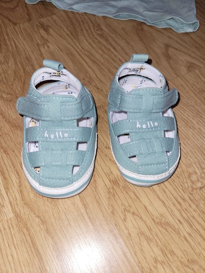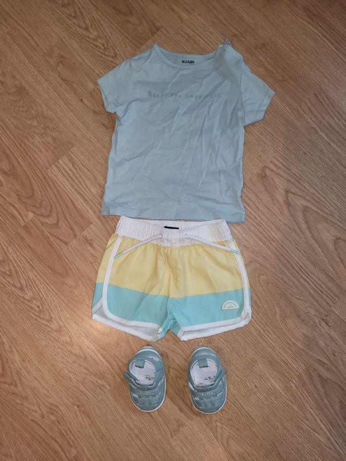 Vends ensemble été kiabi : tee-shirts + short + sandales. Très peu porté Sandale: 3-6 mois Vêtements : taille 6 mois (63-69cm).
