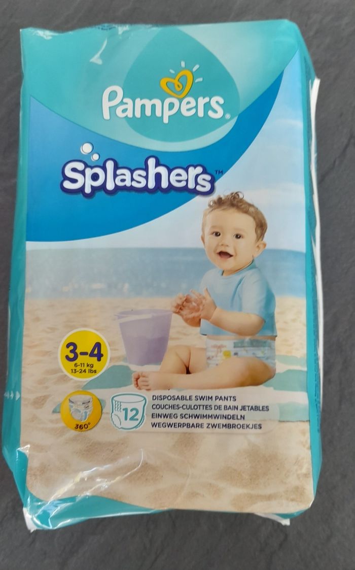 Je vends un paquet neuf de couches-culottes de bain jetables marque Pampers Splashers. 12 couches. Taille 3-4.