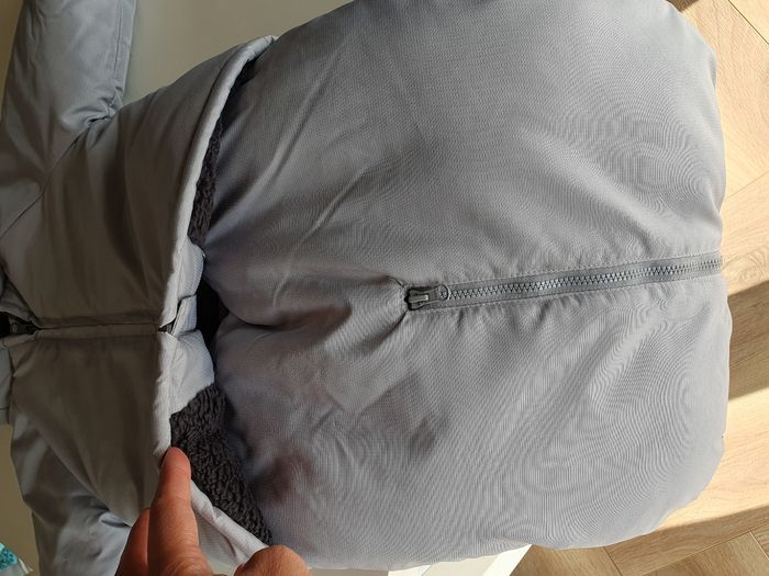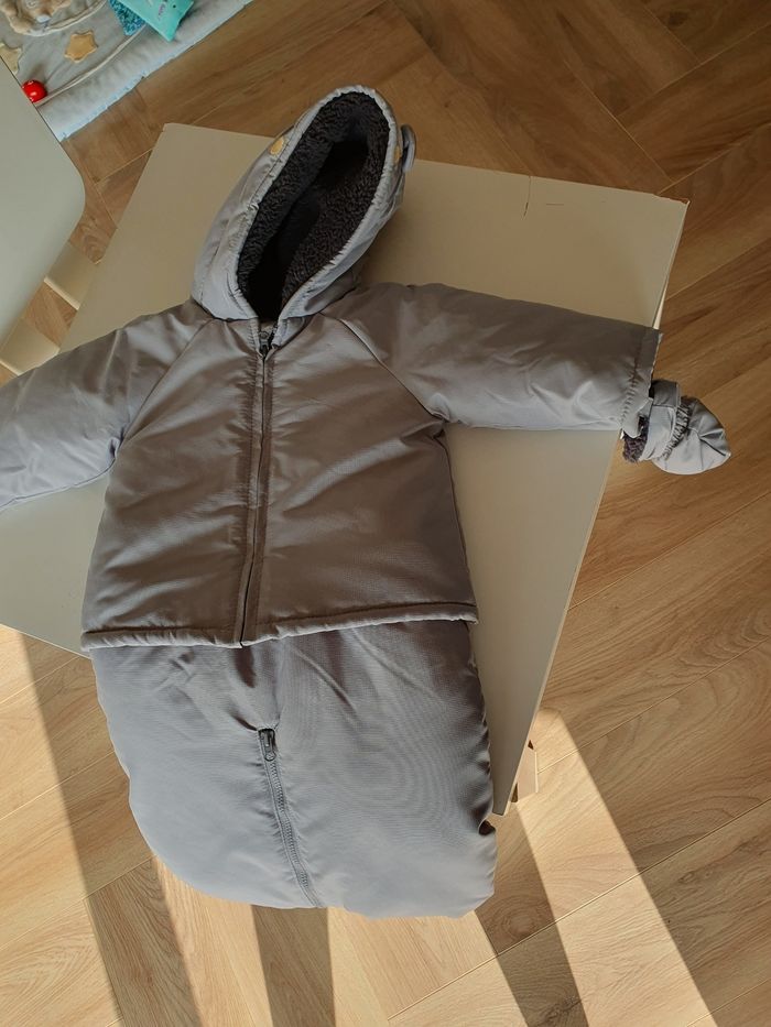 Combinaison neuve, jamais porté. Peut être porté que en manteau ou en entier, avec fermeture éclair entre les jambes pour les sièges auto, cosy etc. Avec des moufles. Bien chaude. Mixte.