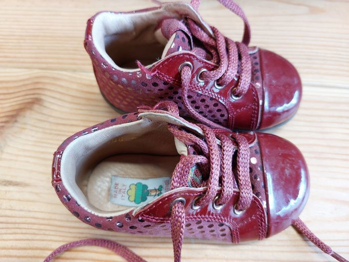 Jolies bottines pour petite fille. Taille 20. Idéal pour les premiers pas. Marque Italienne. Couleur rouge. Effet miroitant sur le bout + cuir en nubuk avec paillette sur le reste de la chaussure. Très chic. Très bon état. Ch
