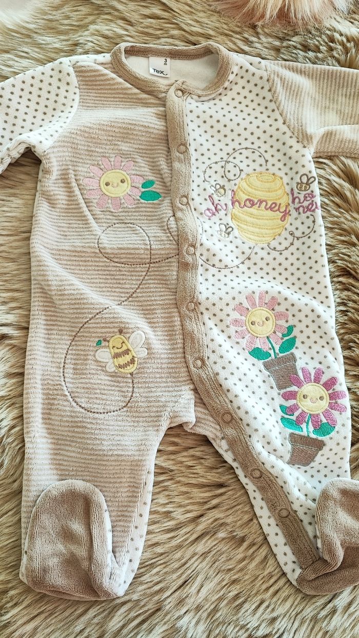 Pyjama velours beige, marron clair et blanc (dessin abeilles et fleurs) avec ouverture sur le devant. De la marque tex En taille 3 mois En très bon état / maison non fumeur #laetitia33700filletroismois