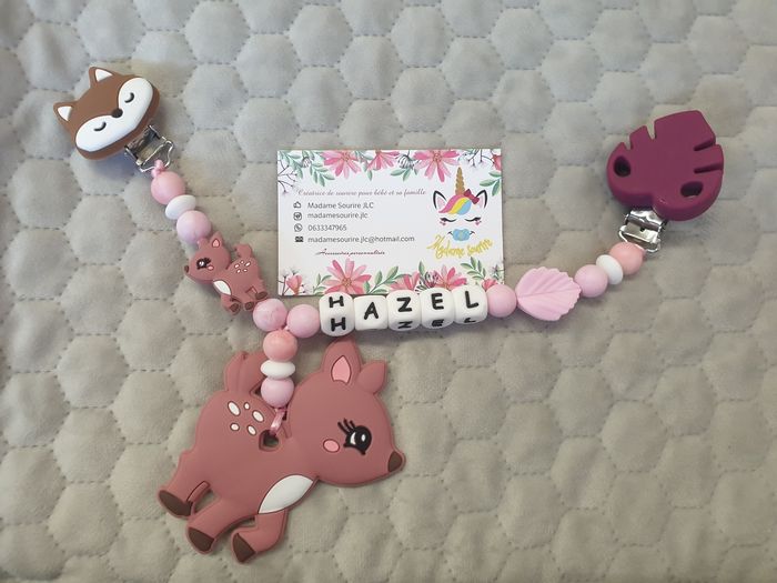 Un attache doudou faon avec jouet de dentition intégré en silicone alimentaire ou/et bois naturel 100% perdonnalisable. Énormément de choix de composants, vous trouverez forcement votre bonheur et si je n'ai pas, je peux le commander. N'hésitez pas à m'envoyer un message pour que l'on crée ensemble votre accessoire idéal.