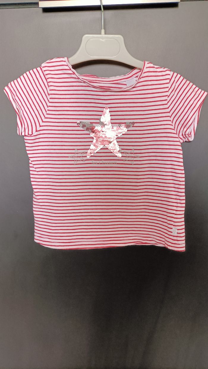T-shirt rayé rose et blanc, avec étoile de mer en sequins réversibles. Taille 3 ans 2€