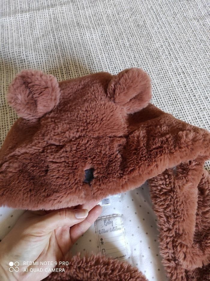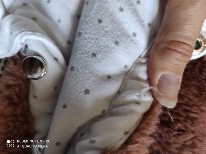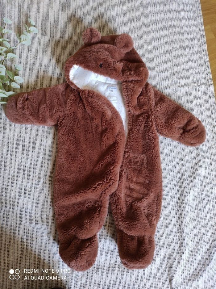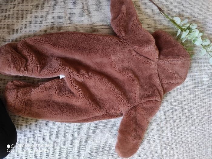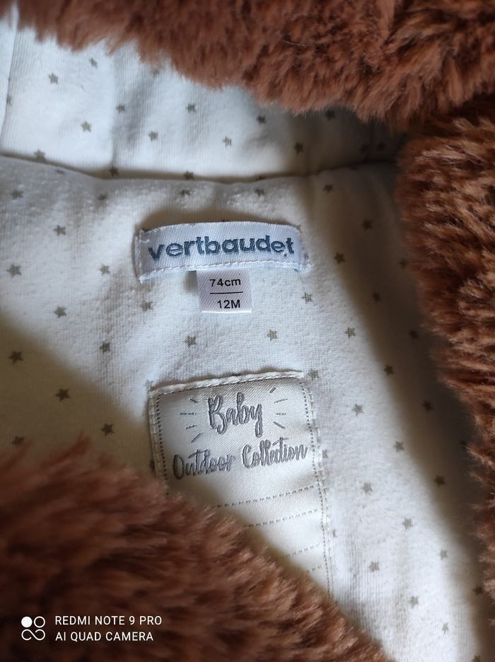 Taille 12 mois combinaison pilote de la marque Verbaudet. Effet pilou pilou extrêmement doux. Deux boutons entre les jambes se sont décousu voir sur les photos ... Les pressions sont restées accroché entre elles cela peut être changer et ne gêne en rien la tenue de celle-ci.