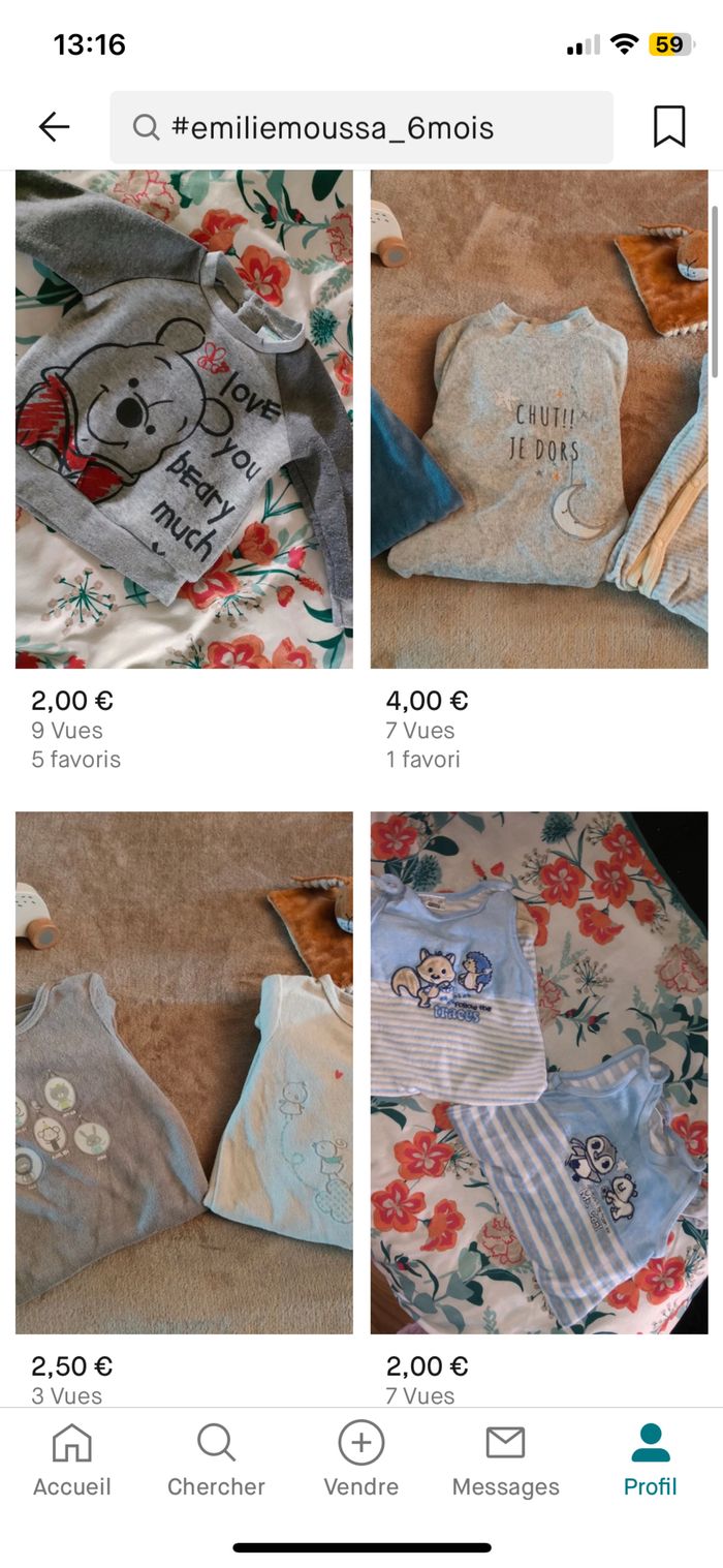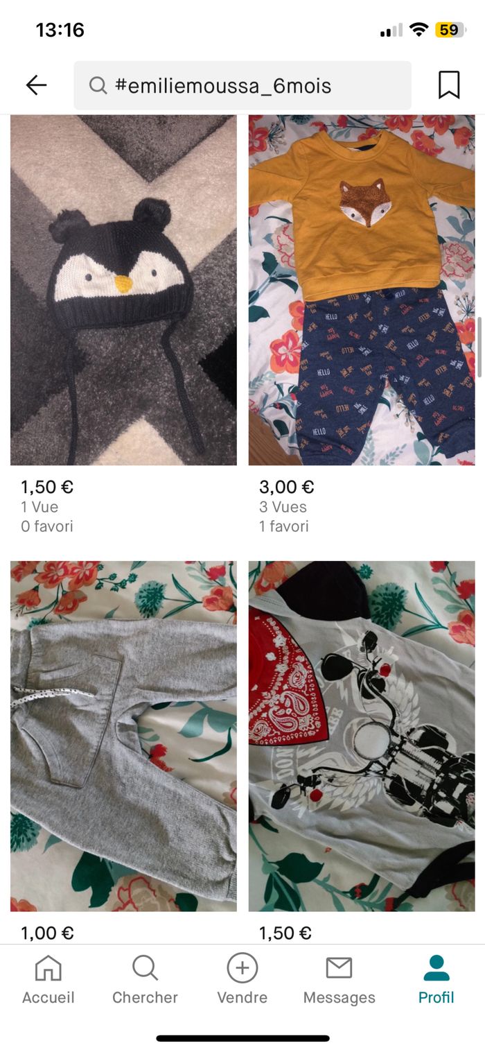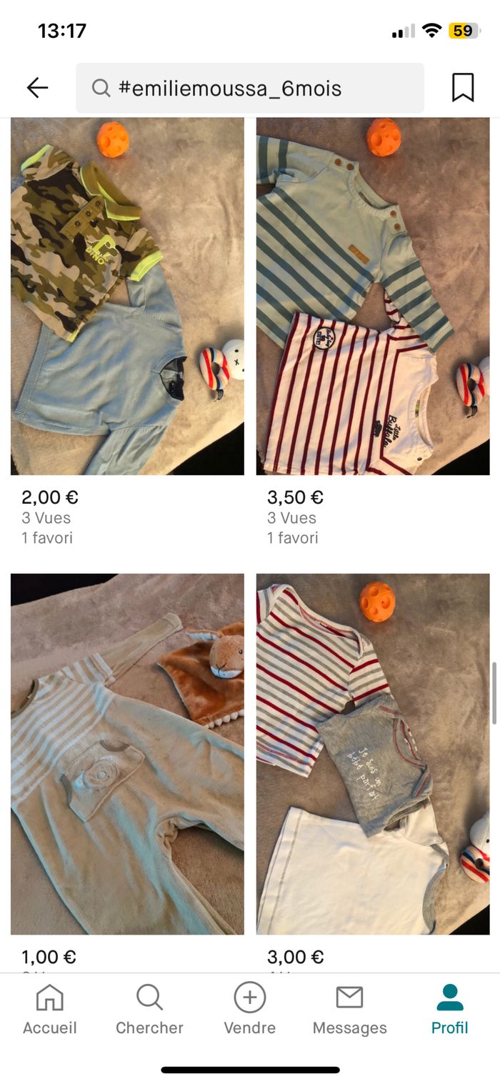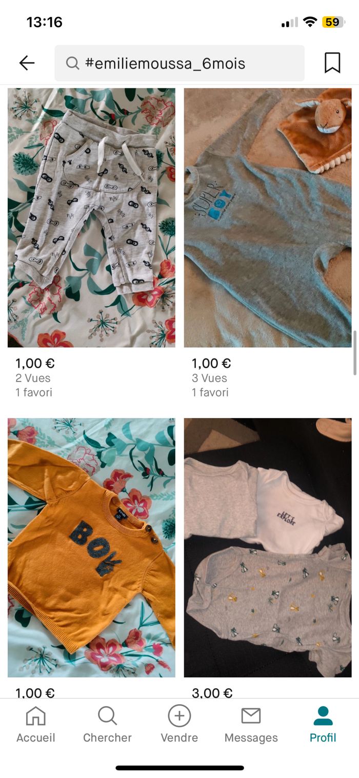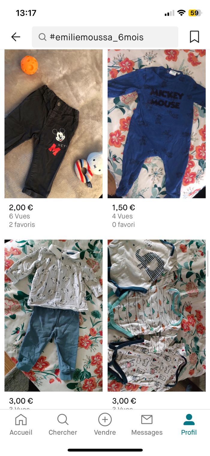 Bonjour, Je vend le dressing de mon fils né cet été voilà le 6 mois. Les prix vont de 1€ body/pyjama à 3€ pour les ensembles les affaires sont peu portées en très bon état. Principalement du Disney baby, orchestra dpam tao kiabi érgee et baby club. N’hésitez pas pour plus de fotos .