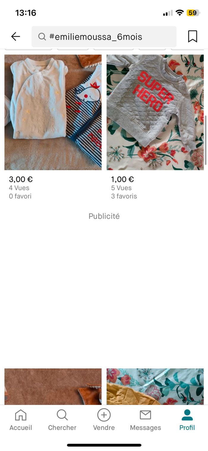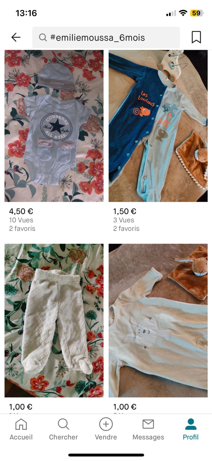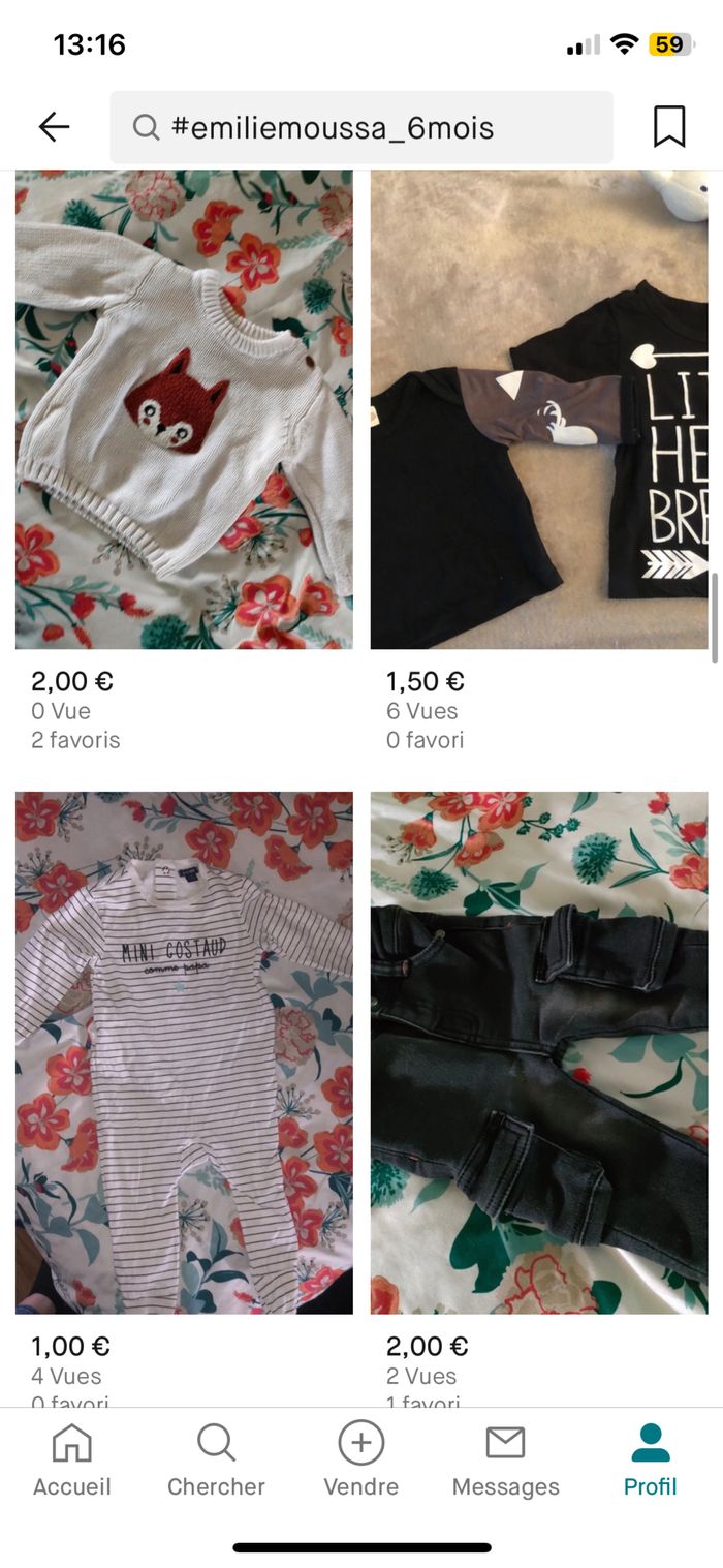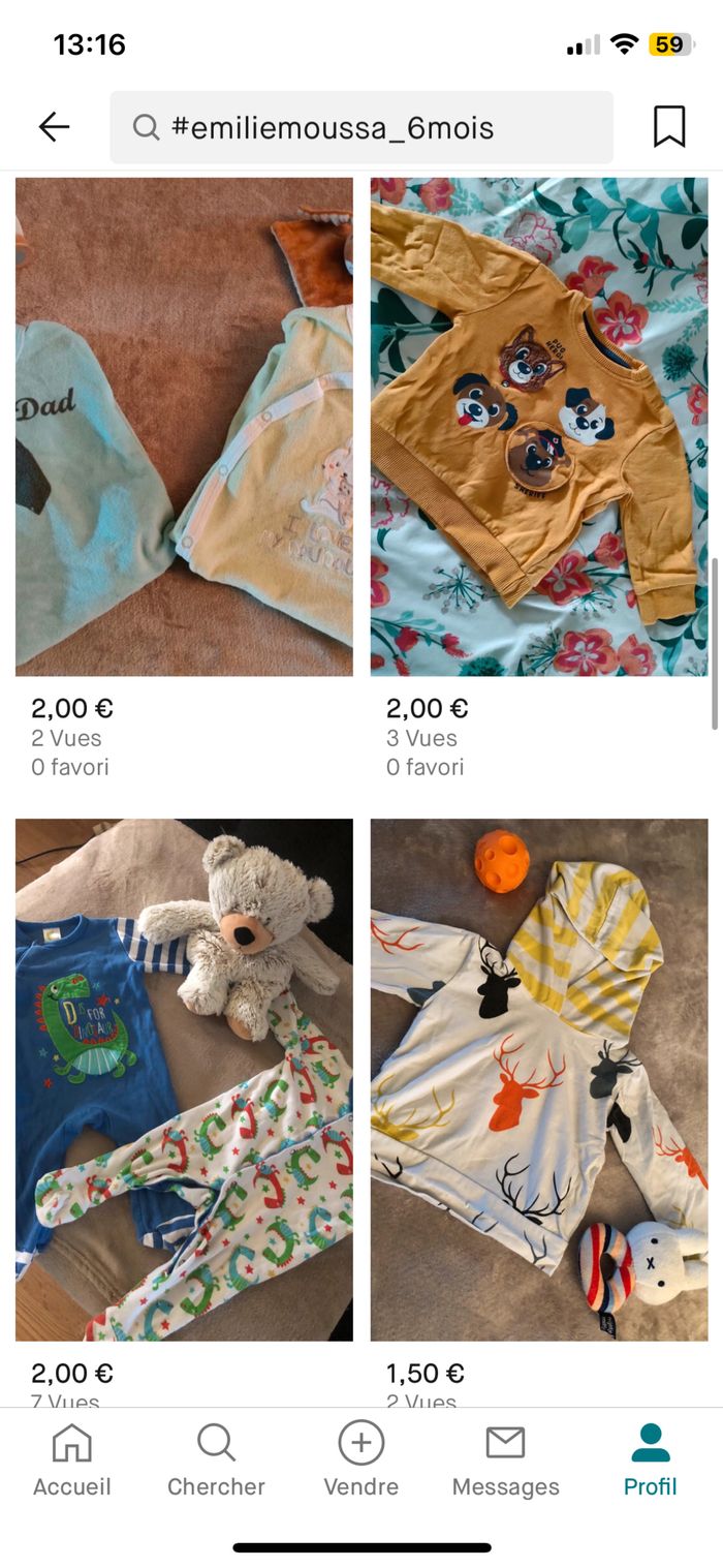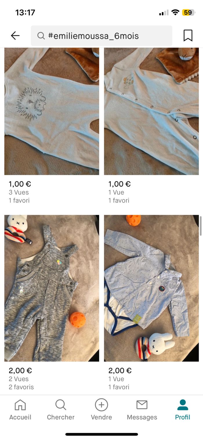 Bonjour, Je vend le dressing de mon fils né cet été voilà le 6 mois. Les prix vont de 1€ body/pyjama à 3€ pour les ensembles les affaires sont peu portées en très bon état. Principalement du Disney baby, orchestra dpam tao kiabi érgee et baby club. N’hésitez pas pour plus de fotos .