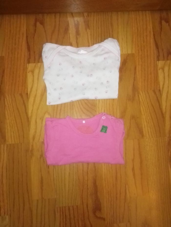 Lot de 2 bodies 12 mois manches longues. Un est en coton bio Très bon et bon état Un a des tâches d'un produit de soin je l'offre Prix ferme merci