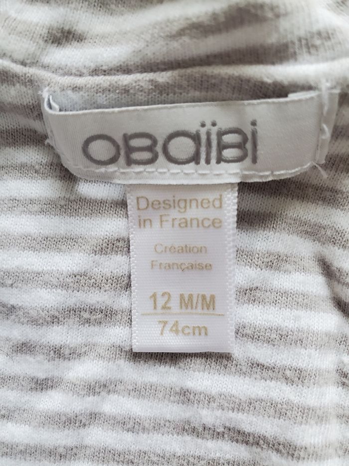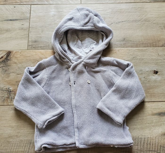 Gilet à capuche obaibi en 12 mois. Excellent état, doublé en coton rayé blanc et gris