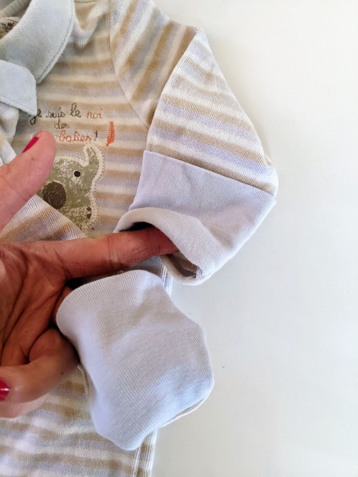 Magnifique pyjama grenouillère dors-bien velours de coton rayé bleu et beige, très doux