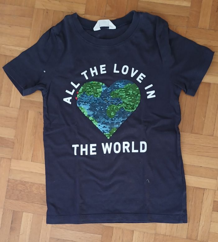 Neuf sans étiquette. Jamais porté. Taille : 6 - 8 ans. Bleu marine. Motifs : cœur rouge ou planète terre. Texte : "All the love in the world". Envoi rapide et soigné.