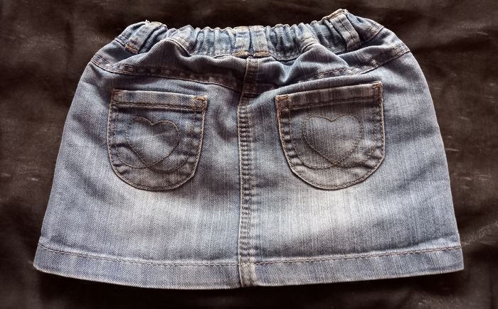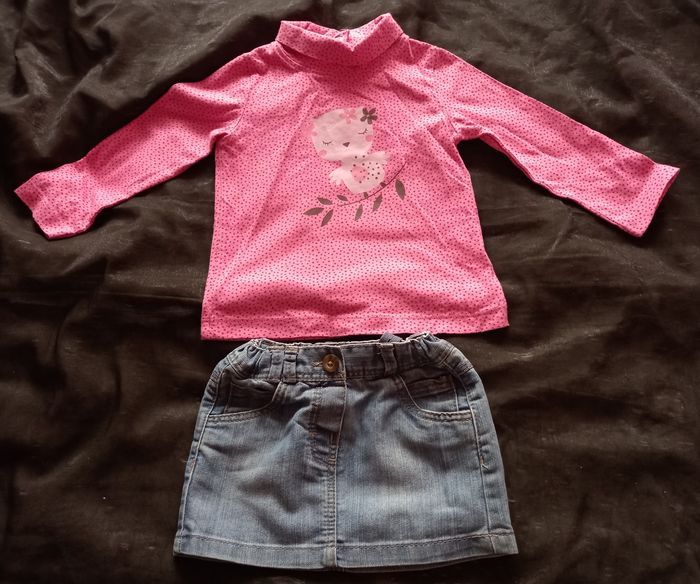 ENSEMBLE 18 MOIS COMPOSÉ D'UN SOUS PULL TISSAIA ET D'UNE JUPE EN JEANS TAPE À L'OEIL AVEC RUBAN RÉGLABLE, POCHES DEVANT ET DERRIÈRE