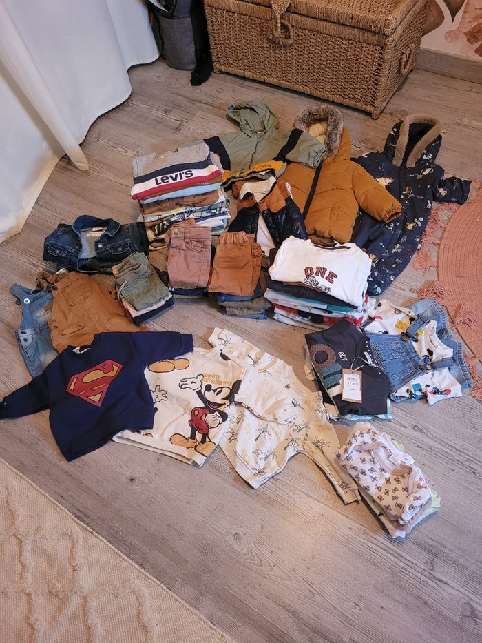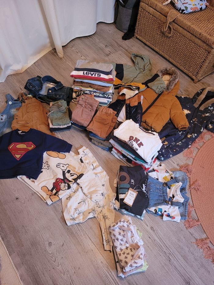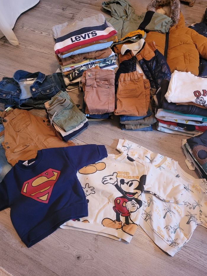 Gros lot 6 mois bébé garçon comprends 20 pulls 6 hauts manches longues 2 haut manches courtes 12 pantalons, jeans 4 joggings 3 salopettes 3 veste en jeans Une combi Une veste sans manches Une doudoune Une veste 8 bodies manches courtes 7 ensemble