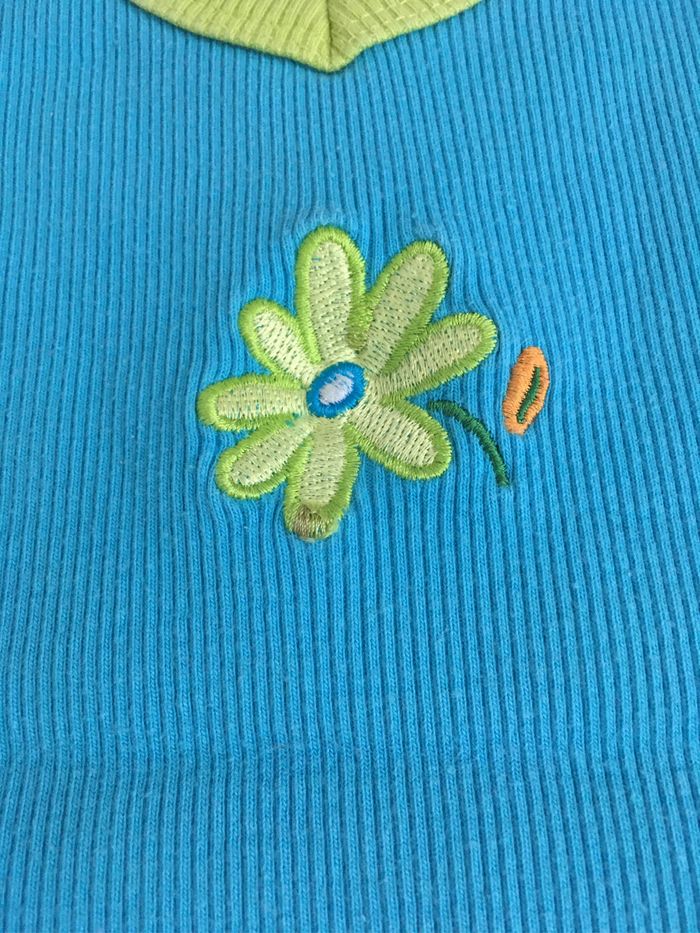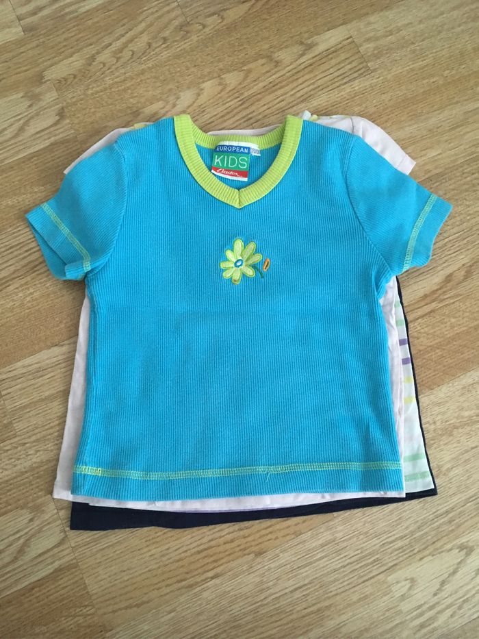 Lot de 5 t-shirt en bon état, taille 110-116. Marques différents. Sur la fleur du t-shirt bleu il y a une petite tache mais peu visible.