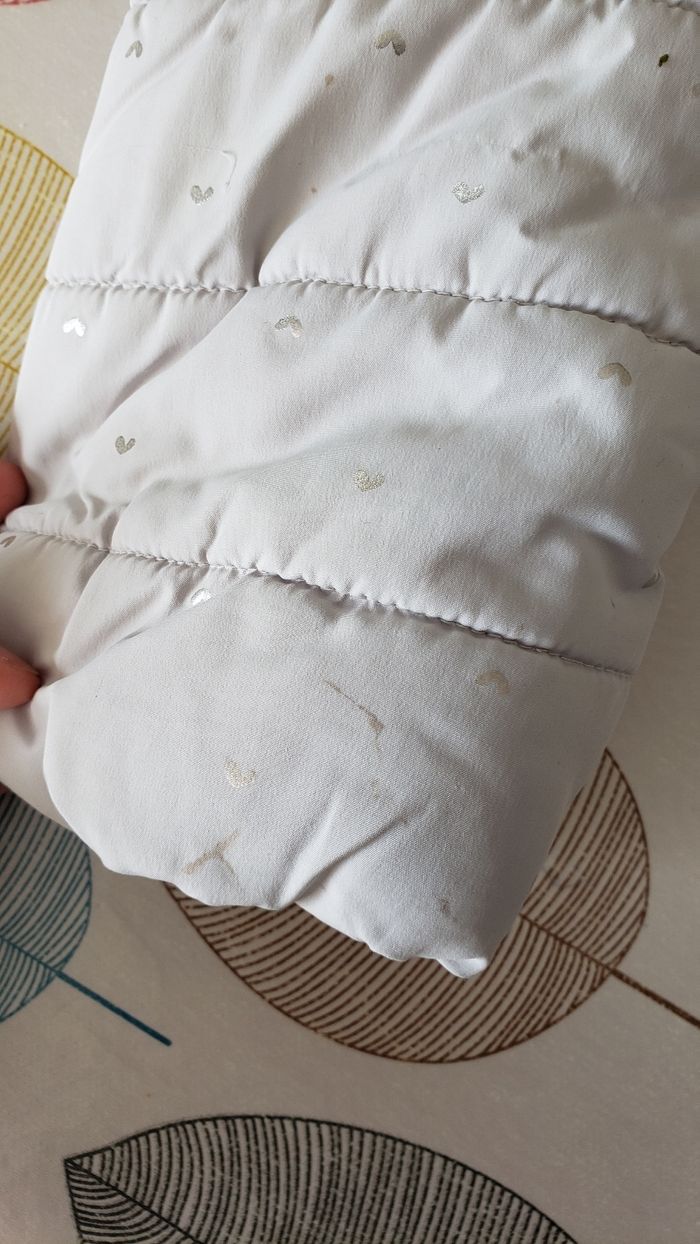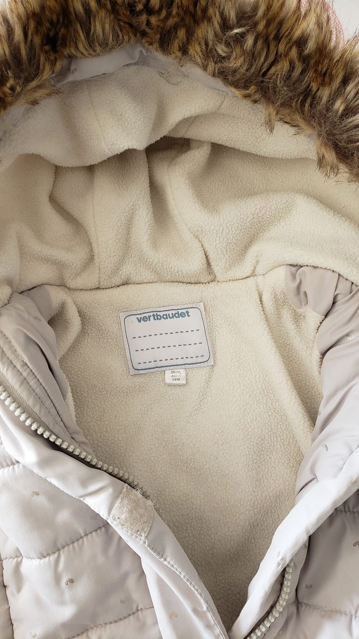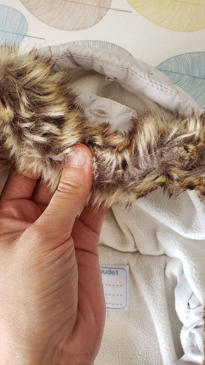 Interieur polaire. 2 taches sur une manche 1 bouton manque sur la capuche. Ne gene en rien l'utilisation du manteau Voir photos