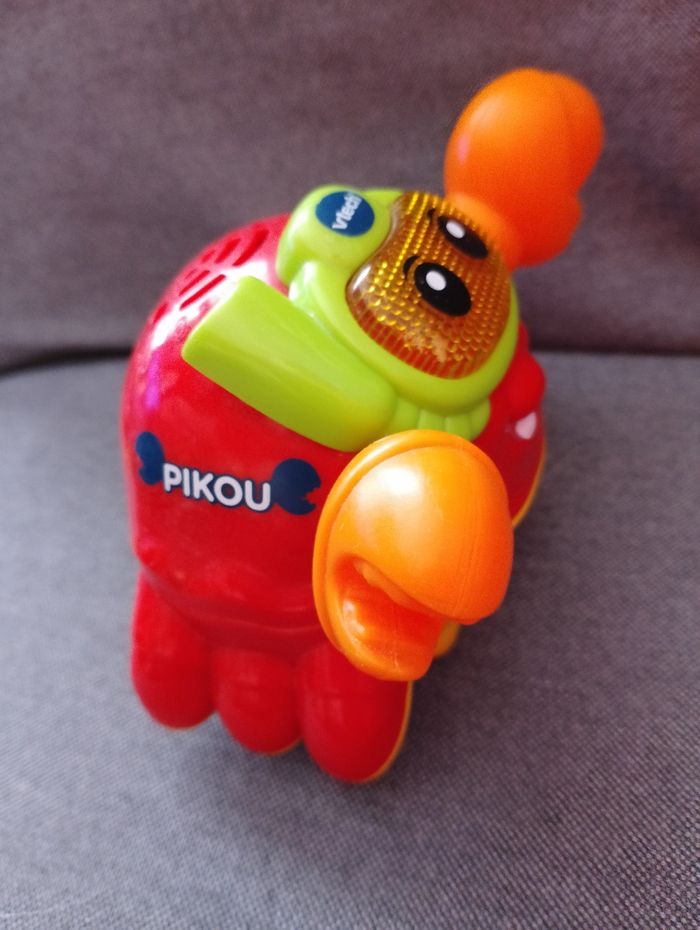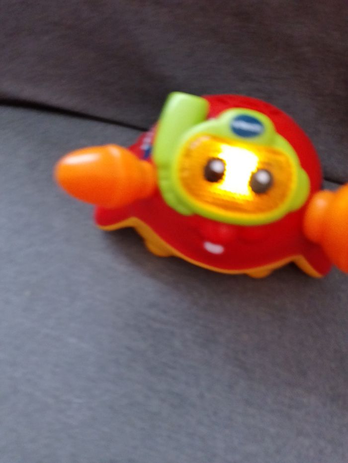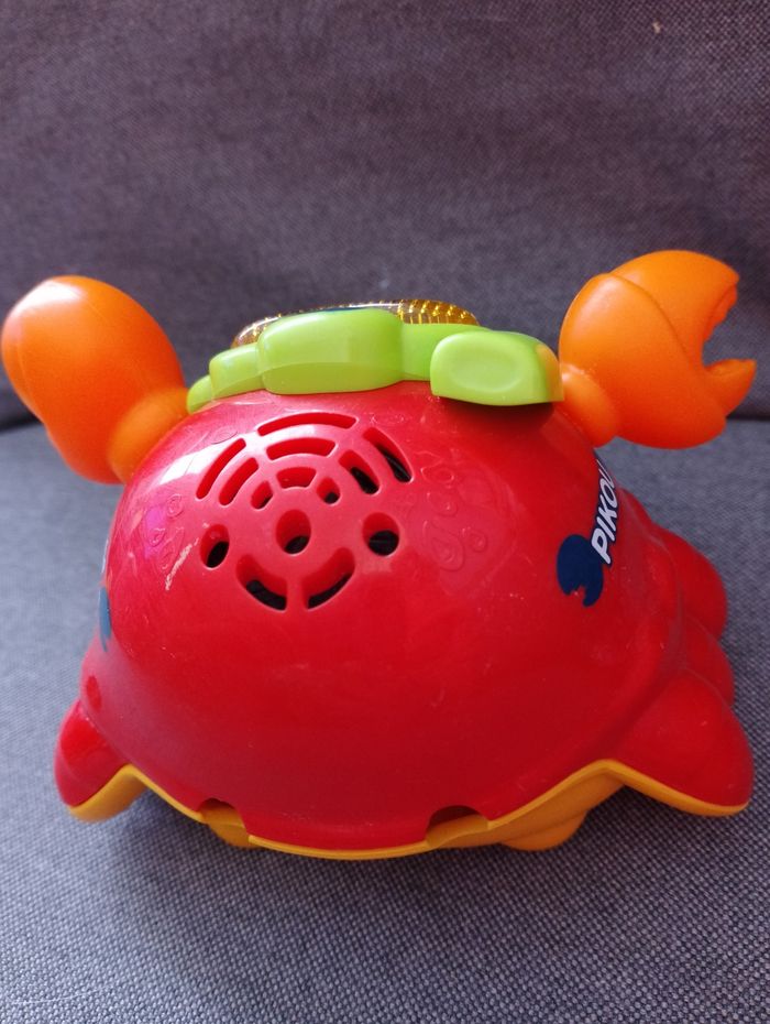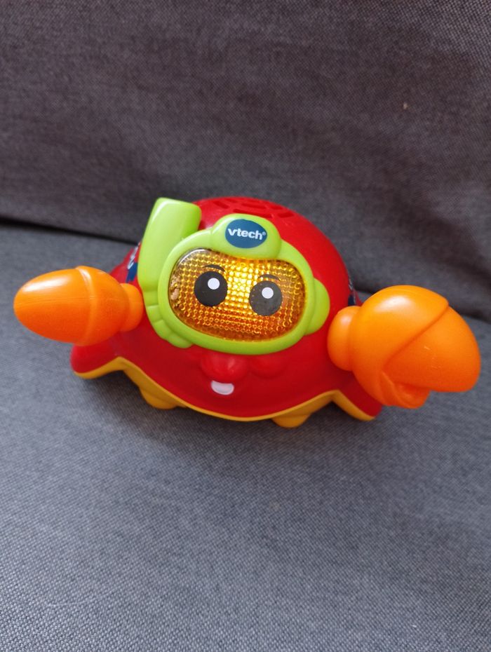 Tut Tut Marin Pikou, le crabe pince-tout VTECH Jeux jouet de bain Dès 12 mois Interactif, il flotte sur l'eau Pikou parle, chante et s'illumine même dans l'eau du bain ! 4 chansons rigolotes et 10 mélodies Bouton ON OFF enfoncé mais fonctionne toujours puisqu'il faut appuyer sur ses yeux pour le faire fonctionner et parler