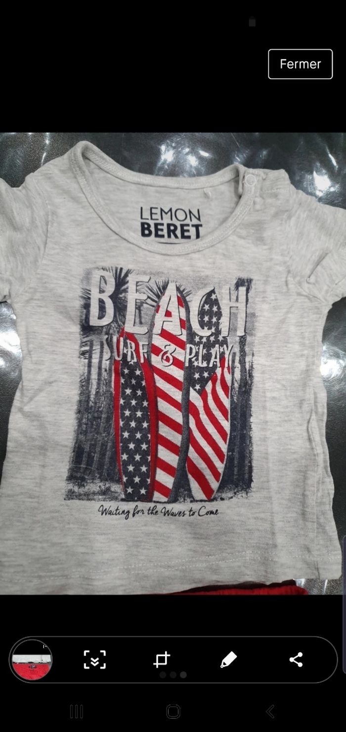 Short + t-shirt lemon beret, taille 6 mois, comme neuf, peu porté.