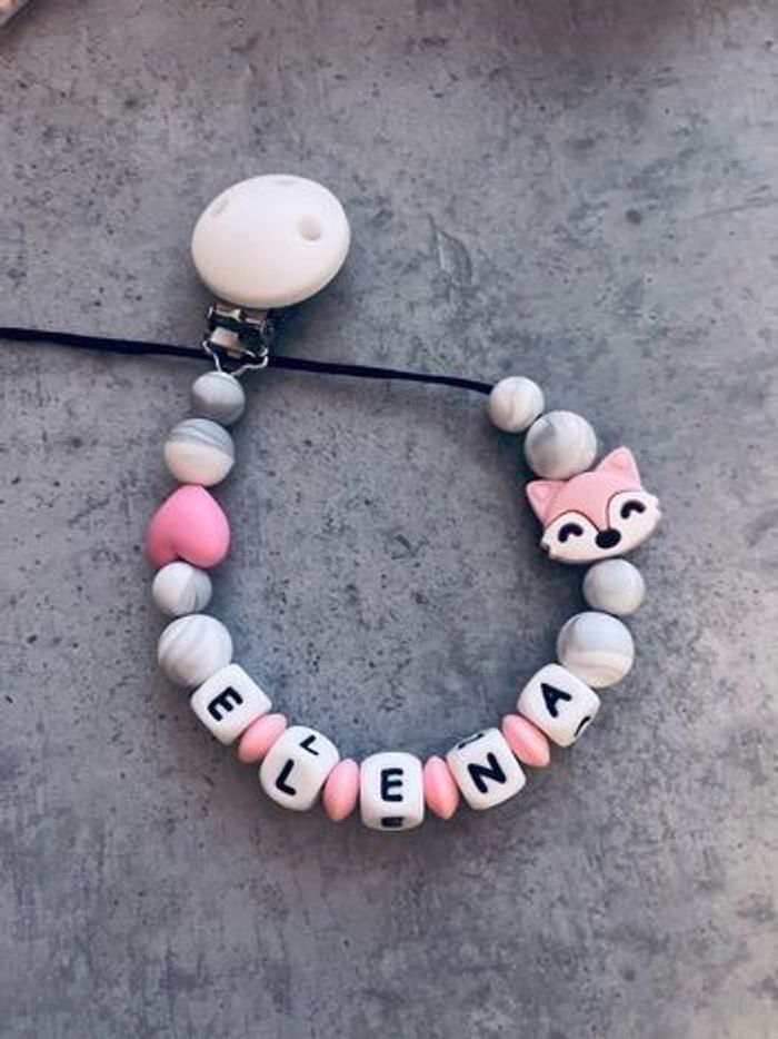 Attache tétine personnalisé en silicone ou en bois au souhait de l’acheteur . Personnalisable au choix de l’acheteur que ce soit la couleur comme le prénom ou le thème . Le fil est doublé pour plus de sécurité tout le long de l’attache tétine. N’hésitez pas à me demander et regarder mon dressing. Une photo vous sera envoyée avant l’expédition pour vous ayez un aperçu du rendu.