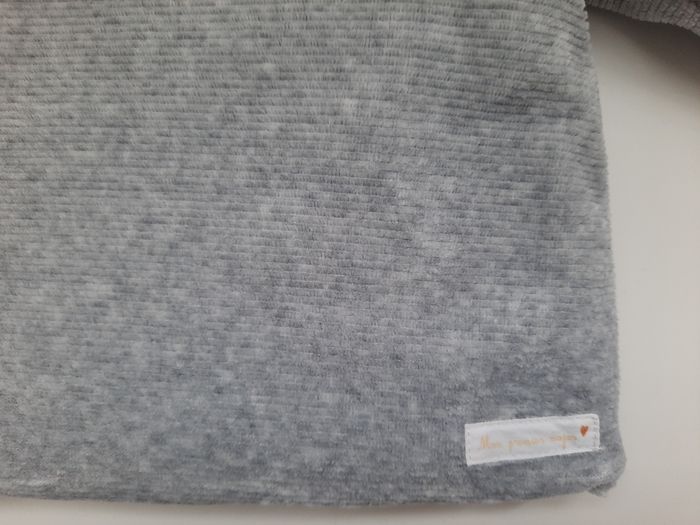 Acheté trop tôt et finalement pas porté par bébé Hugo. Manteau en velours 1000 raies au rendu strié et texturé avec une doublure en jersey avec motif hérisson, ouverture par boutons-pression sur le devant.