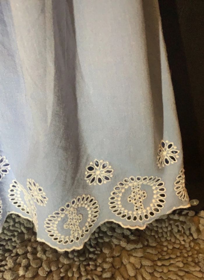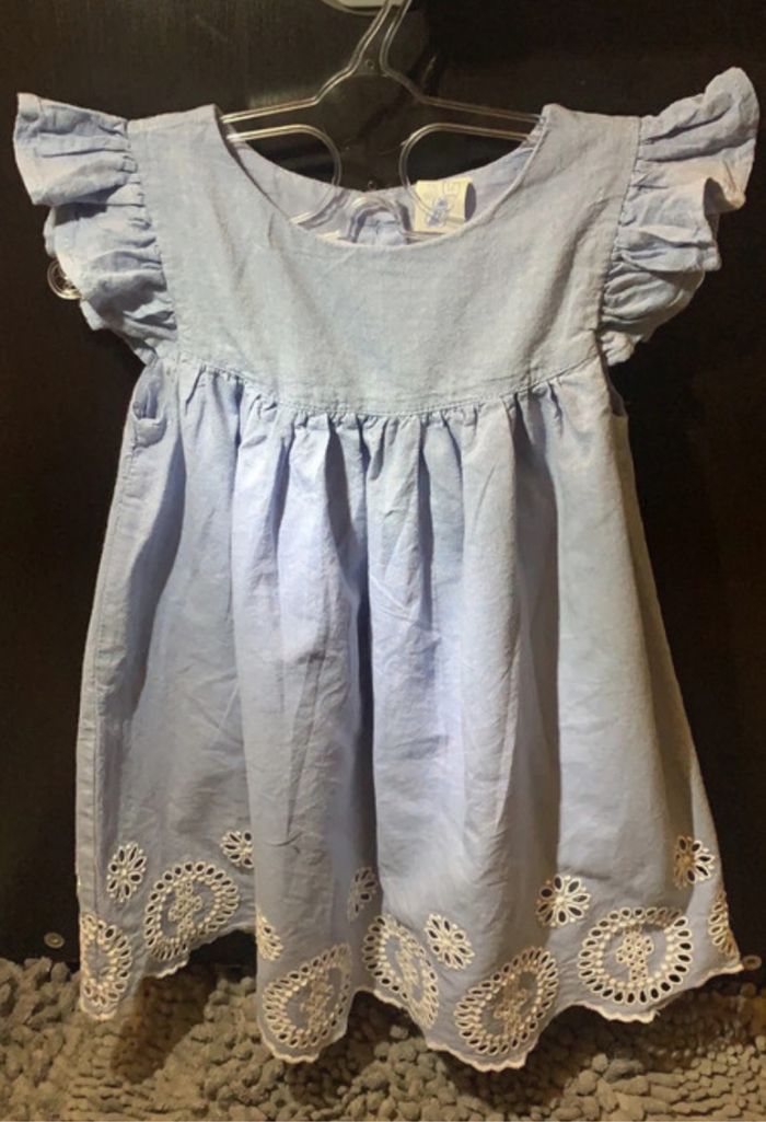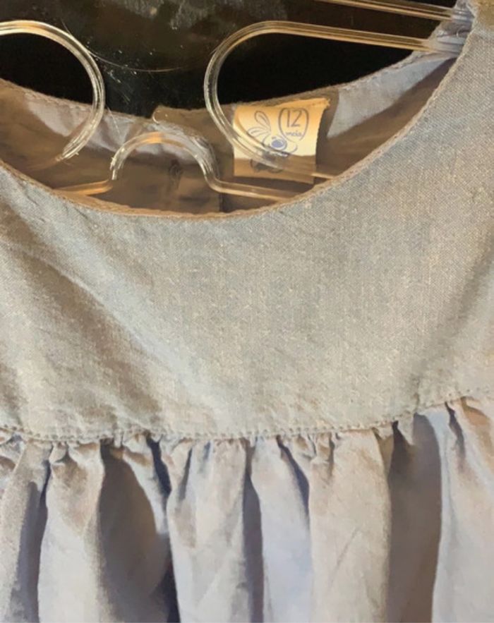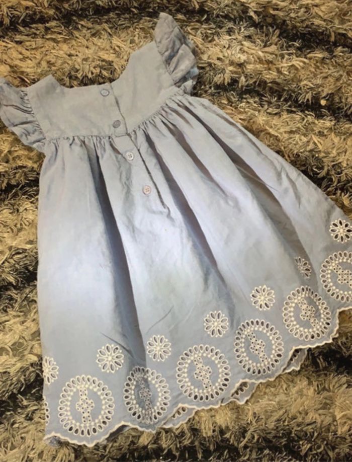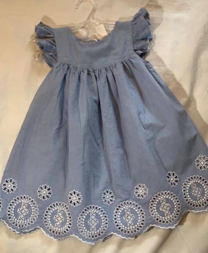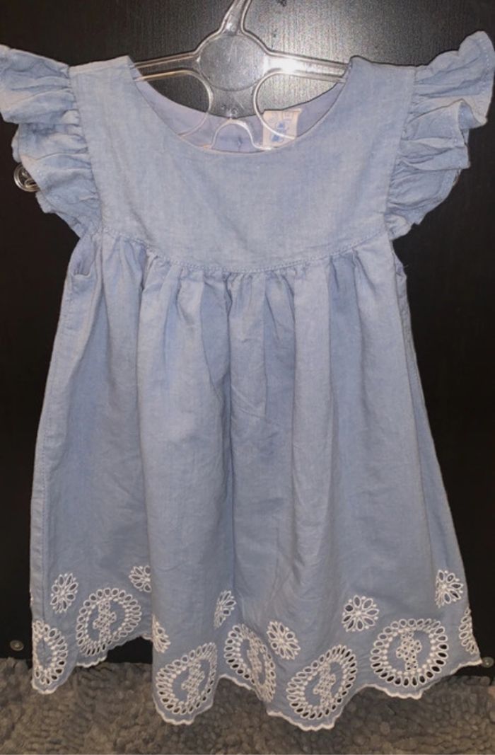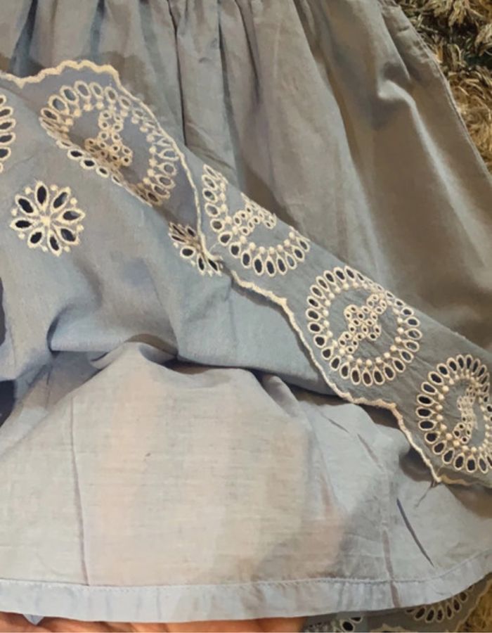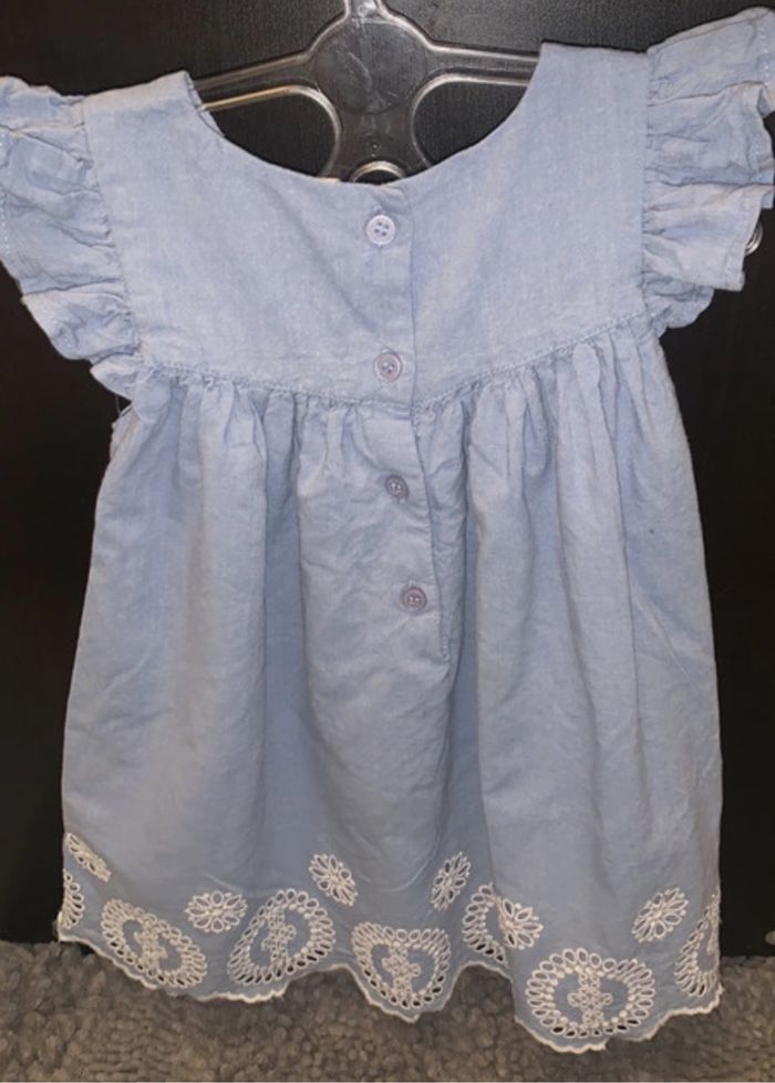 Très jolie robe avec broderie sur le bas 100% coton Taille : 12 mois (74cm) Couleur : bleu ciel et broderie blanche