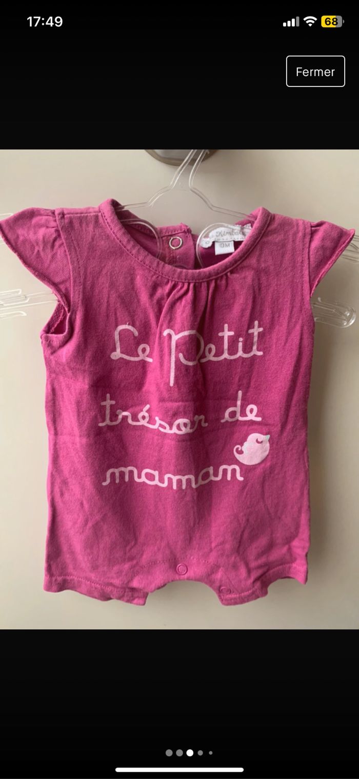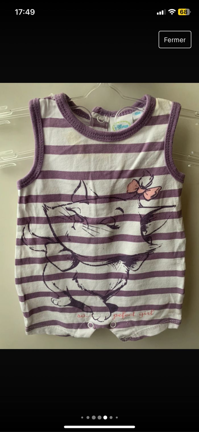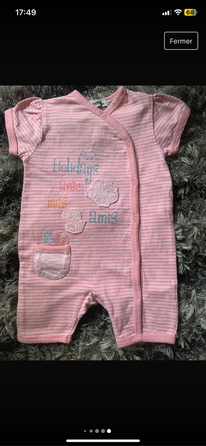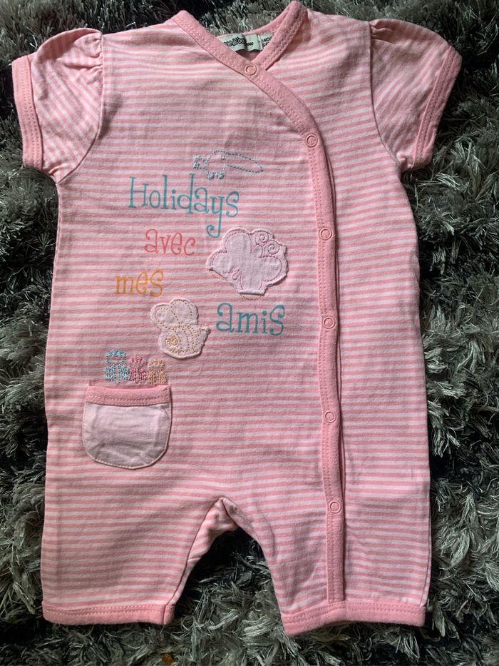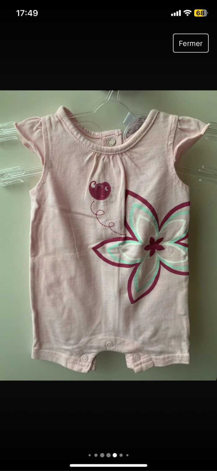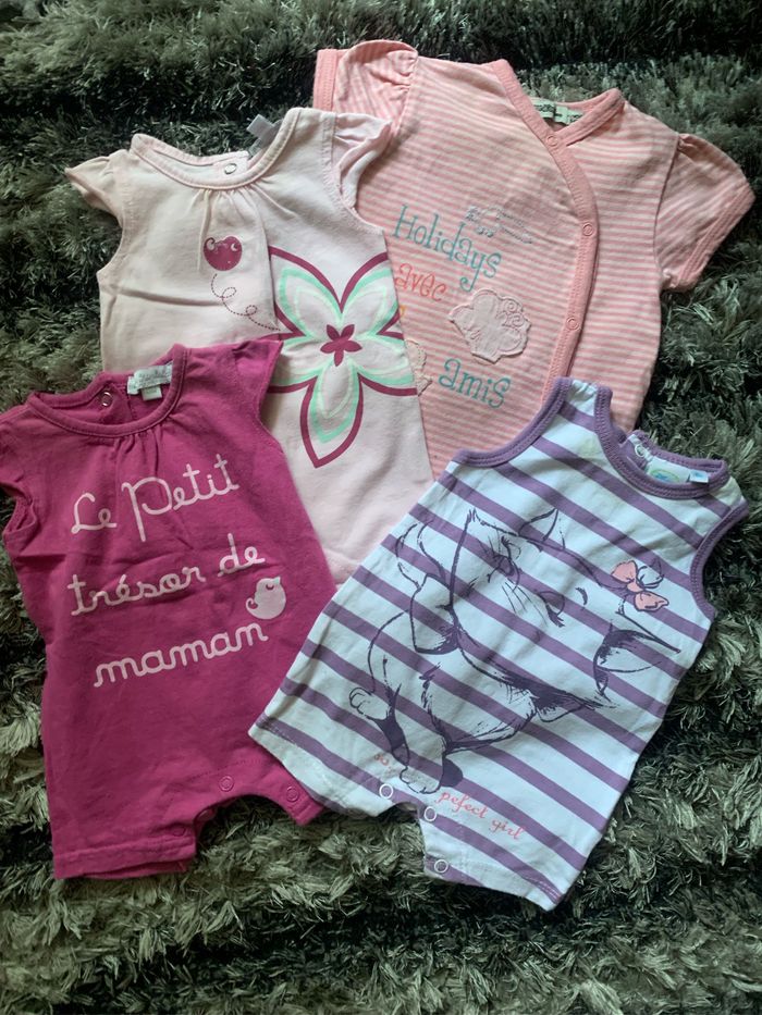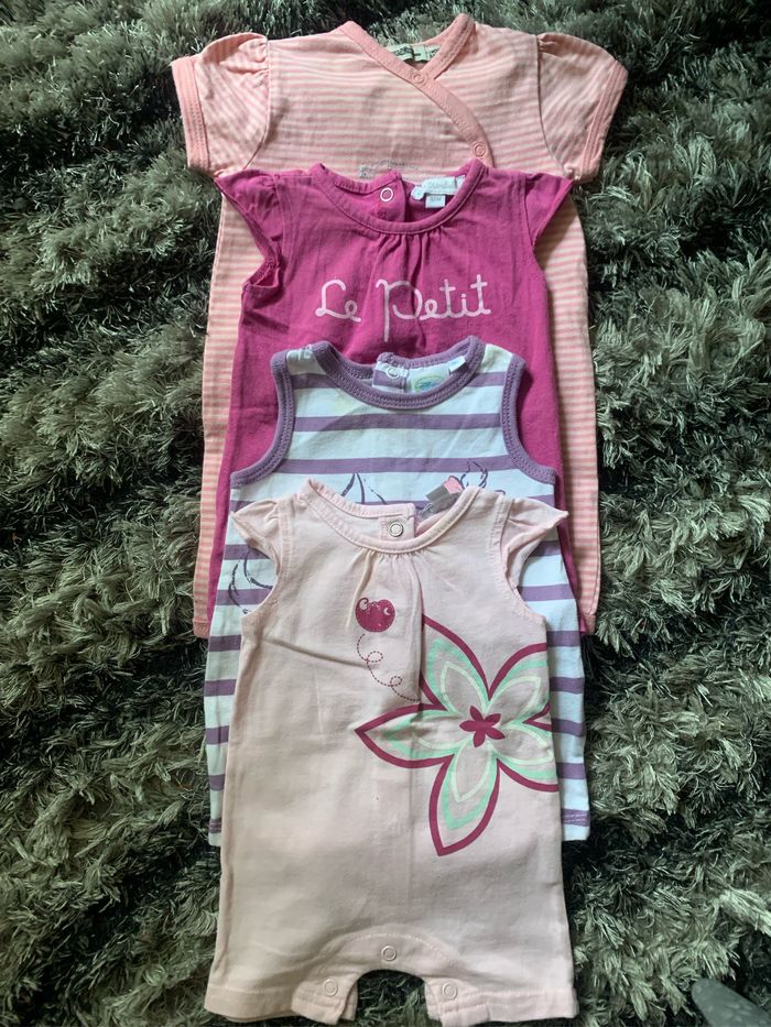 Lot de 4 combinaisons shorts bébé fille 100% coton Taille : 0 mois Dimensions épaules : 14/15cm Dimensions aisselles : 18/19cm Dimensions longueur : 31cm Taille : 1 mois marque : tape à l’œil Marque : Disney et Petit Kimbaloo