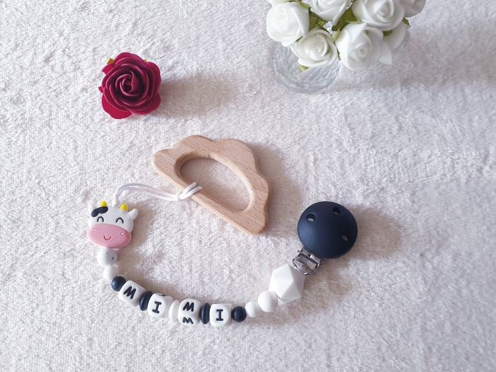 Coffret Attache tétine vache + jouet dentition bois 100% personnalisable en silicone alimentaire et/ou bois naturel. Large choix de perles, le style, les couleurs, nous personnalisons ensemble main dans la main pour créer votre accessoire idéal. Contactez-moi par message pour personnaliser ou tout renseignement.