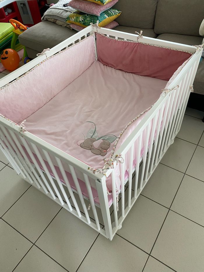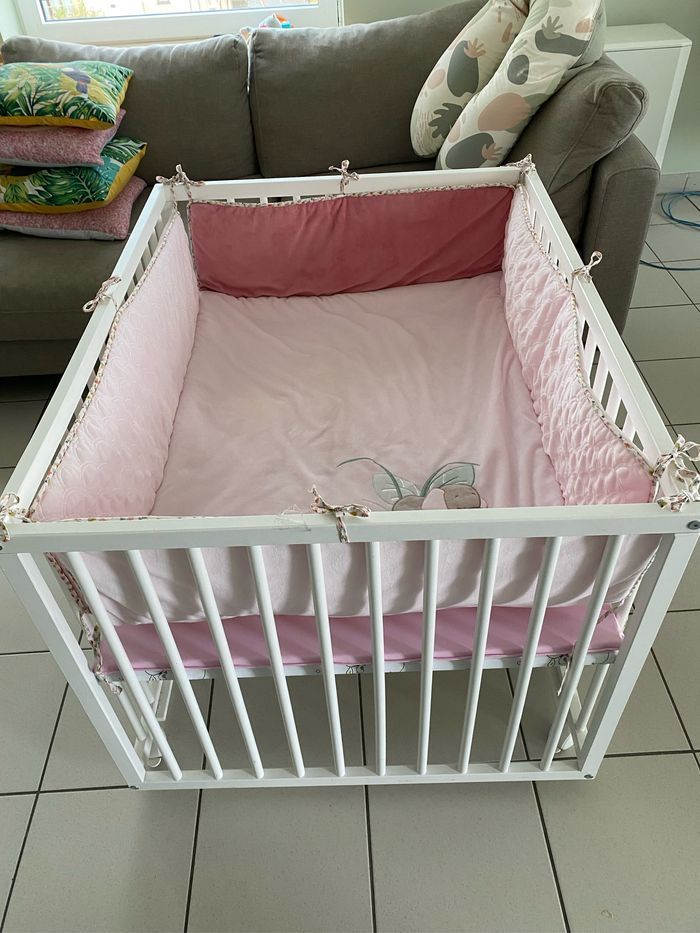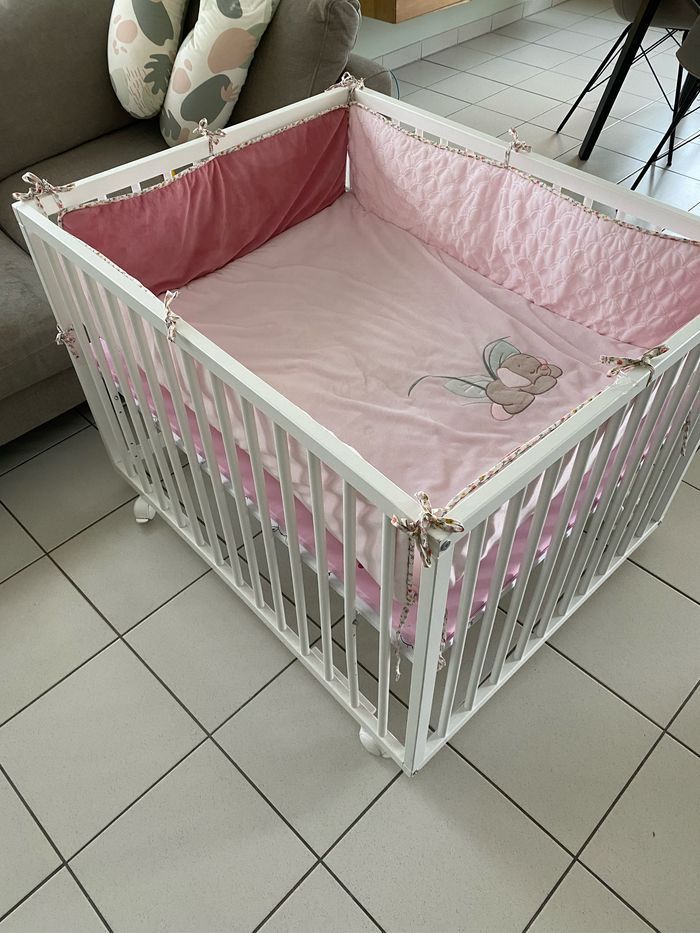 Parc en bois blanc sur roulette de la marque Amall ll. L 96 x Lg 76 cm 3 positions Se déplace facilement avec les roulettes. Second matelas rose